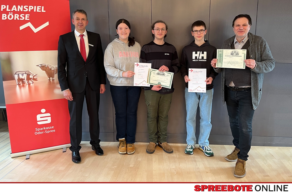 Ende Januar endete das diesjährige Planspiel Börse für rund 96.000 Schüler, Studierende, Azubis und junge Erwachsene. Auch in der 40. Jubiläumsspielrunde konnten sich alle Teilnehmer über 17 Wochen in klassischen und nachhaltigen Anlagestrategien üben und dabei grundlegendes Börsenwissen aneignen. Unter dem Einfluss der Energiekrise, des Krieges gegen die Ukraine und steigender Inflation setzten die Teilnehmer in diesem turbulenten Börsenjahr vor allem auf die US-Riesen Amazon, Tesla sowie Apple und investierten branchenübergreifend auch in Adidas und Microsoft. Die Teilnehmer schlossen insgesamt rund 1,2 Millionen virtuelle Aufträge mit einem Gesamtumsatz von fast 4 Milliarden Euro ab. Im Geschäftsgebiet der Sparkasse Oder-Spree beteiligten sich insgesamt 74 Teams mit 156 Teilnehmern.