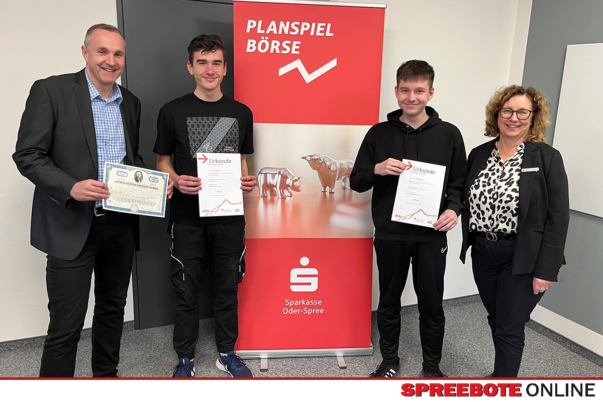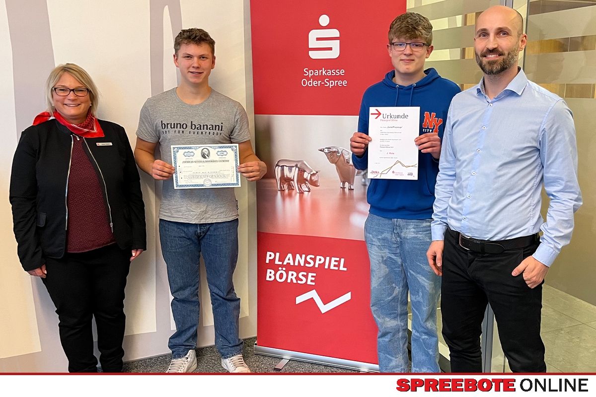 Ende Januar endete das diesjährige Planspiel Börse für rund 96.000 Schüler, Studierende, Azubis und junge Erwachsene. Auch in der 40. Jubiläumsspielrunde konnten sich alle Teilnehmer über 17 Wochen in klassischen und nachhaltigen Anlagestrategien üben und dabei grundlegendes Börsenwissen aneignen. Unter dem Einfluss der Energiekrise, des Krieges gegen die Ukraine und steigender Inflation setzten die Teilnehmer in diesem turbulenten Börsenjahr vor allem auf die US-Riesen Amazon, Tesla sowie Apple und investierten branchenübergreifend auch in Adidas und Microsoft. Die Teilnehmer schlossen insgesamt rund 1,2 Millionen virtuelle Aufträge mit einem Gesamtumsatz von fast 4 Milliarden Euro ab. Im Geschäftsgebiet der Sparkasse Oder-Spree beteiligten sich insgesamt 74 Teams mit 156 Teilnehmern.