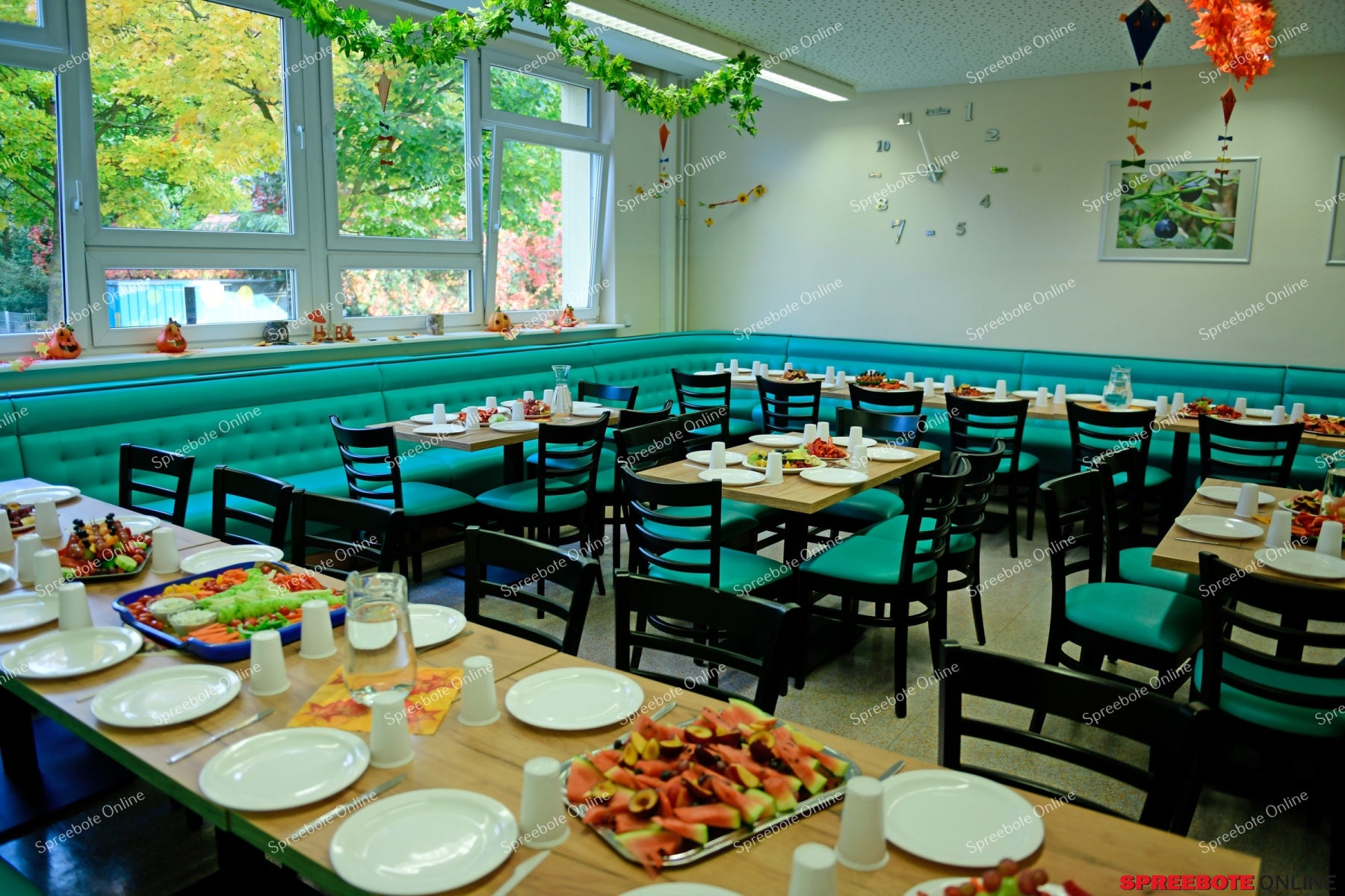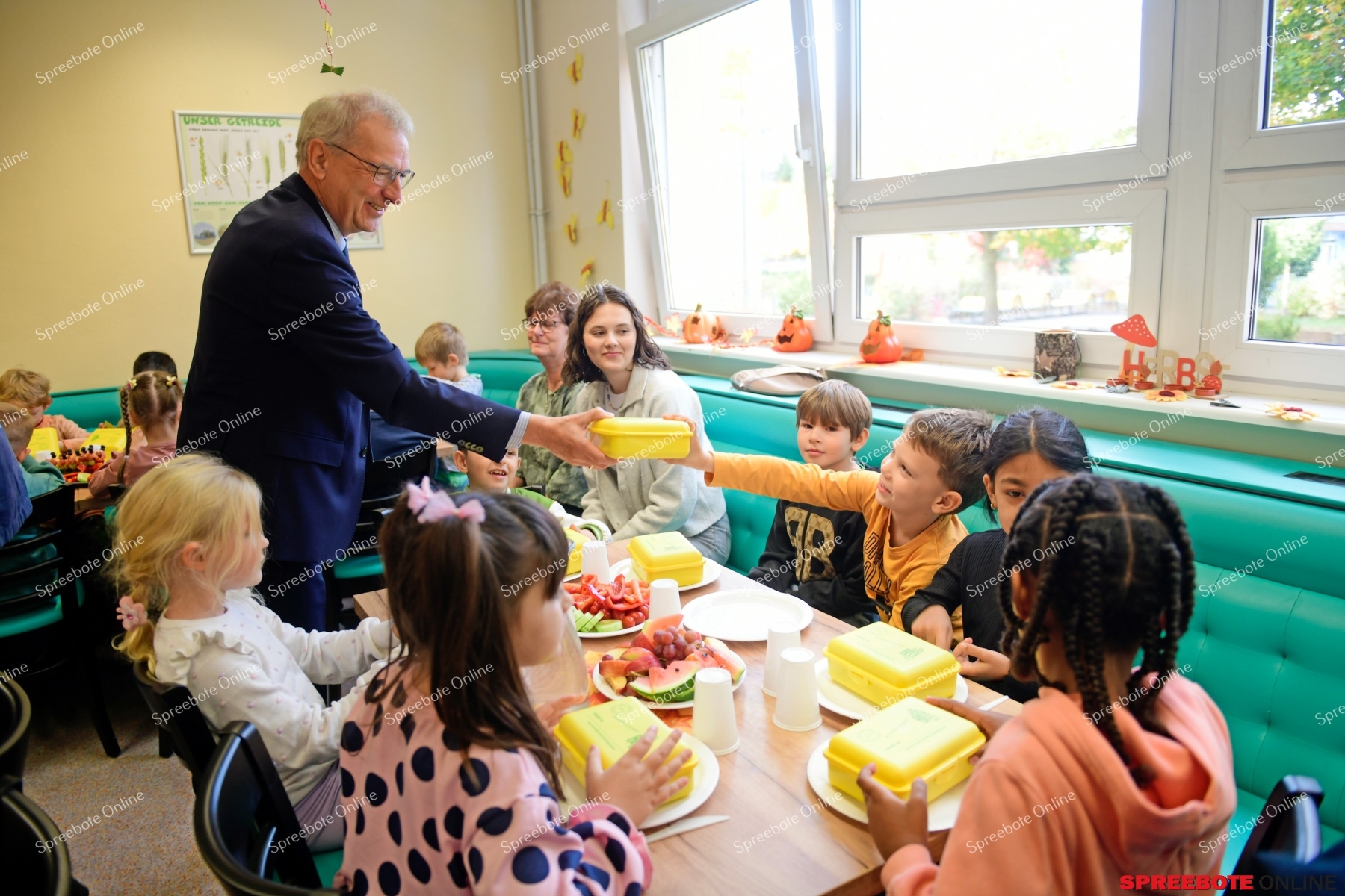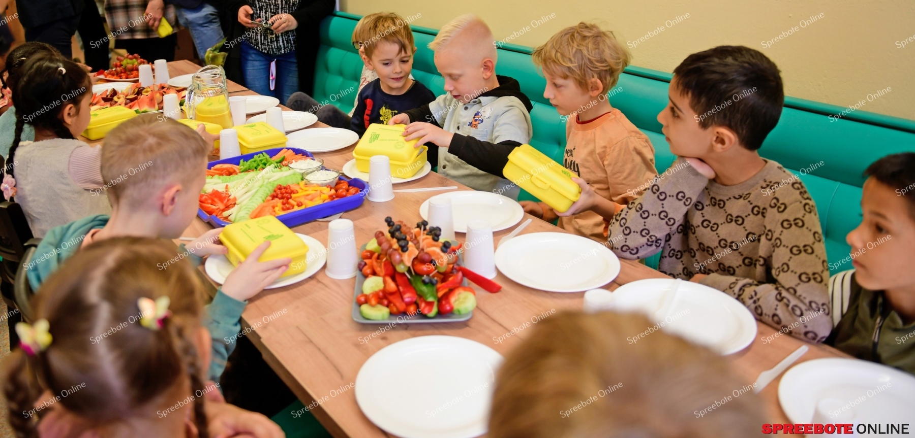 Eine schöne Mischung. Drinnen, in der Cafeteria, saßen rund 70 Kinder an liebevoll gedeckten Tischen, die Eltern und Lehrer der Grundschule für sie vorbereitet hatten. Es war eng, aber herzlich. Hendrik Fischer, Staatssekretär im Bildungsministerium, hatte alle Hände voll zu tun, jede einzelne Box zu überreichen mit echtem Einsatz, unterstützt von Andreas Bös von der AOK Nordost, der Bezirksschulrätin, der Träger die Stadt Fürstenwalde mit der Verantwortlichen für die Schulen Stephanie Dobler, Burckhardt Sonnenstuhl, Meinrad Schmitt und dem gesamten Organisationsteam. Man sah, es war nicht einfach eine Übergabe, sondern ein Moment echter Begegnung.