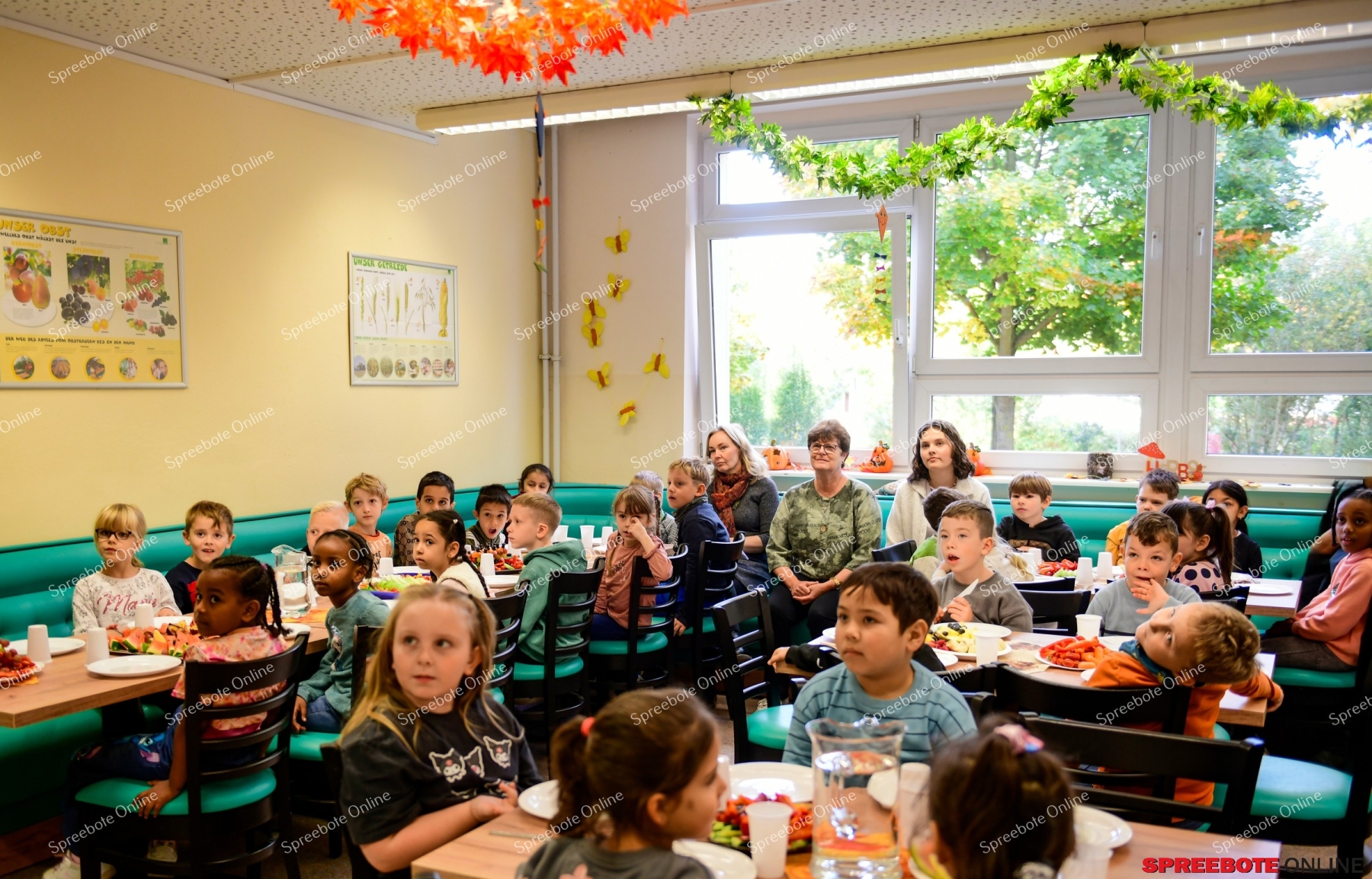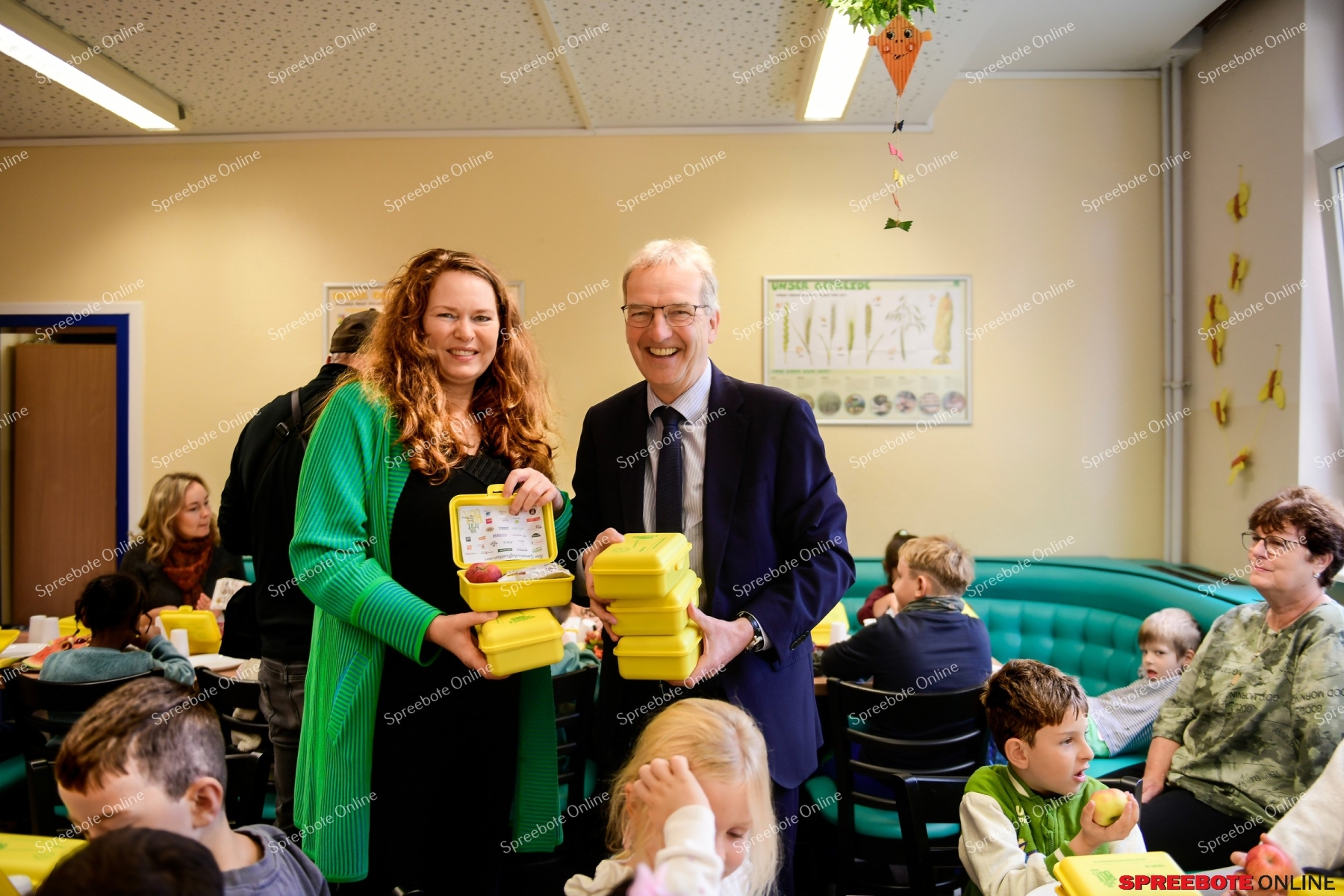 Für Brandenburg fiel der Startschuss an der Sigmund-Jähn-Grundschule in Fürstenwalde. Um neun Uhr ging es los. Die Gäste trafen ein, auf dem Schulhof warteten bereits geduldig die Kinder, die Aufregung war spürbar. Die Sigmund-Jähn-Grundschule ist jedes Jahr mit dabei. Die Engagierte und resolute Schulleiterin Ines Tesch erklärte, warum, viele Kinder in diesem Stadtteil morgens ohne Frühstück zur Schule kommen. Manche wissen schlicht nicht, was gesund ist. Und jedes dritte Kind, so ihre Einschätzung, hat gar nichts dabei. Da ist so eine Aktion eben mehr als nur ein symbolischer Akt. Hier wird etwas wirklich gebraucht. Man spürte, dass der Tag für die Schule eine besondere Bedeutung hatte. Und das spiegelte sich auch in der Gestaltung wider.