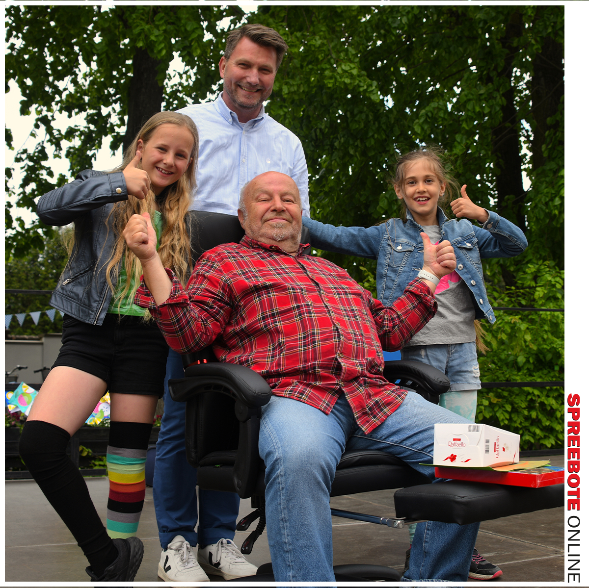 Seifenblasen pusten oder mit einer Schlaufe Riesenblasen zaubern, war ein super Erlebnis. Die Grillstation und der Kuchenstand hatten alle Hände voll zu tun, alle Kids und Eltern zu verköstigen. Viele Eltern nutzen diesen besonderen Tag, um sich ein Bild von der Schule zu machen, dafür standen die Kids Spalier und führten diese durch das Haus. Also Fröhlichkeit, Lebhaftigkeit und Ehrgeiz konnten sich in jedem Falle sehen lassen und einem Fachgespräch mit den Lehrern stand somit auch nichts im Wege. Auf der Bühne wurde es nun spannend, denn die Schlagzeug-Kinder Meggin und Lotti griffen auf das Schüler Budget zurück. Dies hatte Schulleiter Philipp Schittek bei seiner Übernahme als Schulleiter der Rahn Grundschule initiiert. Es war ihnen wichtig, ihrem Schlagzeug-Lehrer Jörg Albrecht endlich mal einen ordentlichen Stuhl zukommen zu lassen. Beide begründeten die Aktion damit, dass er ihnen so oft hilft und dass der Unterricht so großen Spaß macht, dass ihr Lehrer es verdient habe, dabei auch auf einem guten Stuhl zu sitzen. Damit wollten die Schlagzeug-Kinder „Danke!“ sagen. Jörg Albrecht war sichtlich gerührt, drückte die beiden herzlich und bedankte sich für das Geschenk und das Kompliment für seinen Unterricht.