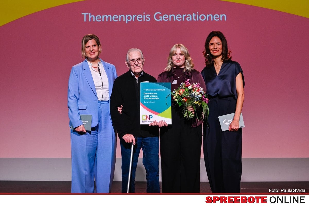Schülerinnen und Schüler der Rahn Education am Spreebogen aus Fürstenwalde haben im Herbst 2024 im Rahmen des Pädagogikunterrichts eigene Projektideen entwickelt. Dabei entstand: „gemeinsam statt einsam“ eine Begegnung von Jungen und Alten im Altenpflegeheim am Dom, welche zunächst über den Jugendfonds der Stadt Fürstenwalde (Bundesprogramm Demokratie leben!) gefördert wurde. Seither treffen sich rund 25 Schüler sowie Bewohnende zu wöchentlichen Kaffeeklatschrunden oder gemeinsamen Aktionen, z.B. Picknick an der Spree, Besuch der Fürstenwalder Brauerei, Bastel- und Spielenachmittage. Am 11.November wurde das Projekt, welches im Sommer von der Stiftung nebenan.de nominiert wurde, zum Siegerprojekt des Deutschen Nachbarschaftspreises 2025 in der Kategorie „Generationen“ gekürt. Den Preis begeistert entgegen nahmen in einem feierlichen Rahmen mit Staatsministerin Schenderlein, die Projektteilnehmenden: Antonia Budarick (Projektinitiatorin), Carolin Schönwald (zuständige Fachlehrerin), Günter Grünwald (Teilnehmer, 99 Jahre), Sahra Kunzendorf und Ruben Schönwald. Mit dem Preisgeld von 5000,00 Euro hat das Projekt künftig ein Budget, mit dem es auf monatliche Highlights setzt, welche einzelnen Schülern unterschiedlicher Klassenstufen organisieren. Dafür gab es bereits eine Abfrage bei den Projektteilnehmenden mit folgenden Wünschen: Malaktion, Schwimmen in der Saarow-Therme, geschichtlicher Vortrag im Ratskeller, Besuch des Weihnachtsmarktes, Picknick an der Spree.