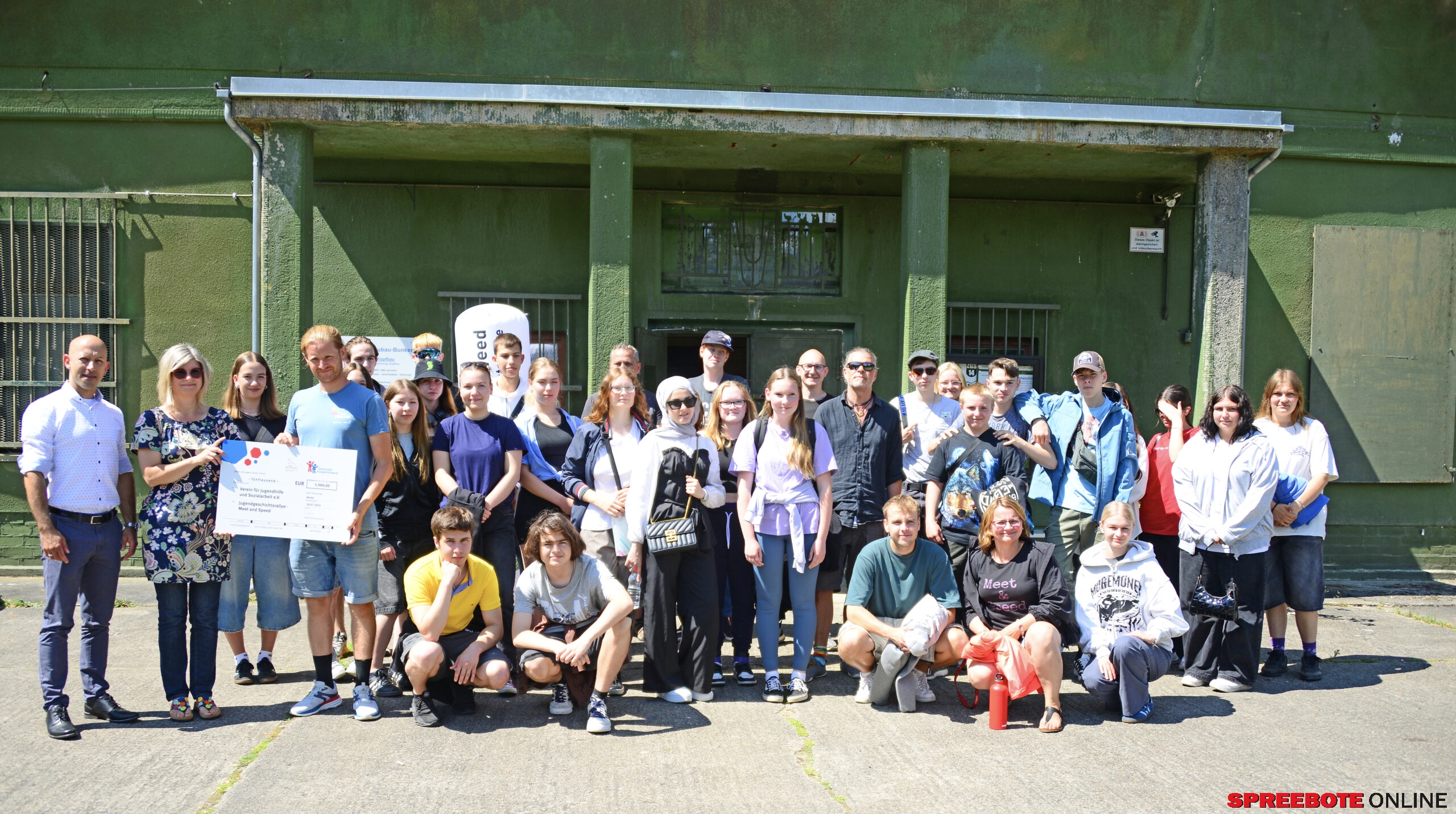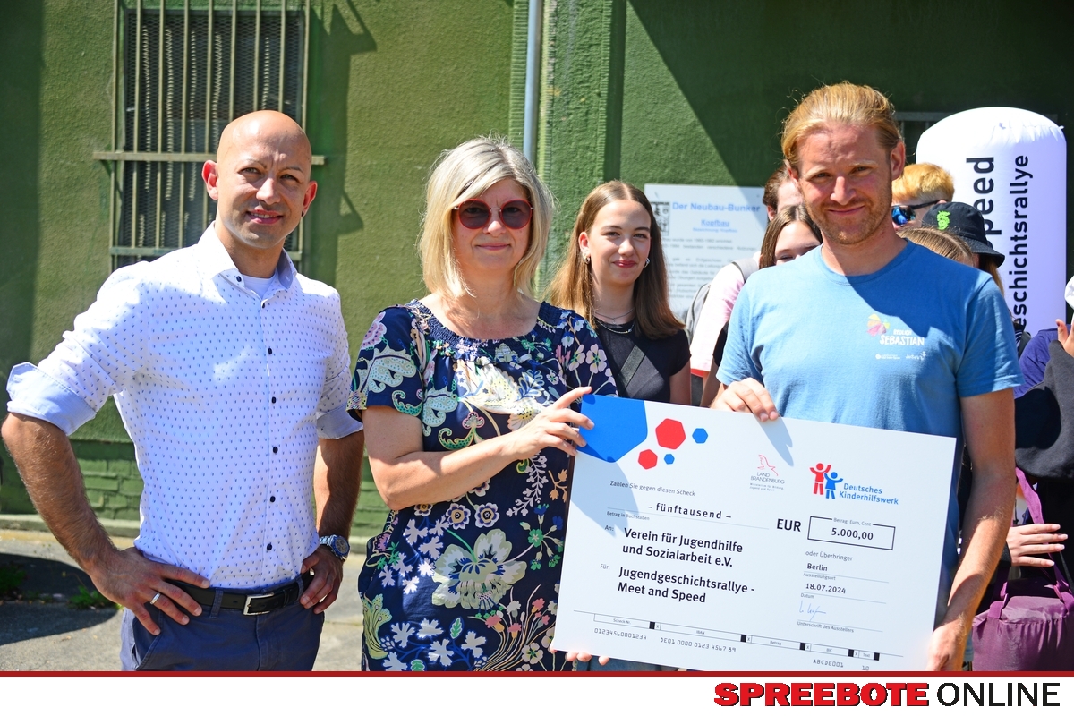Das Deutsche Kinderhilfswerk und das Brandenburger Jugendministerium fördern das Projekt „Jugendgeschichtsrallye – Meet and Speed“ in Fürstenwalde mit 5.000 Euro. Die Übergabe der Unterstützung fand heute vor dem Bunkermuseum am Fuchsbau in Fürstenwalde statt. Daniela Tews, Regionale Koordination des Deutschen Kinderhilfswerkes übergab symbolisch den Scheck an Sebastian Redlich vom Verein für Jugendhilfe und Sozialarbeit e.V.