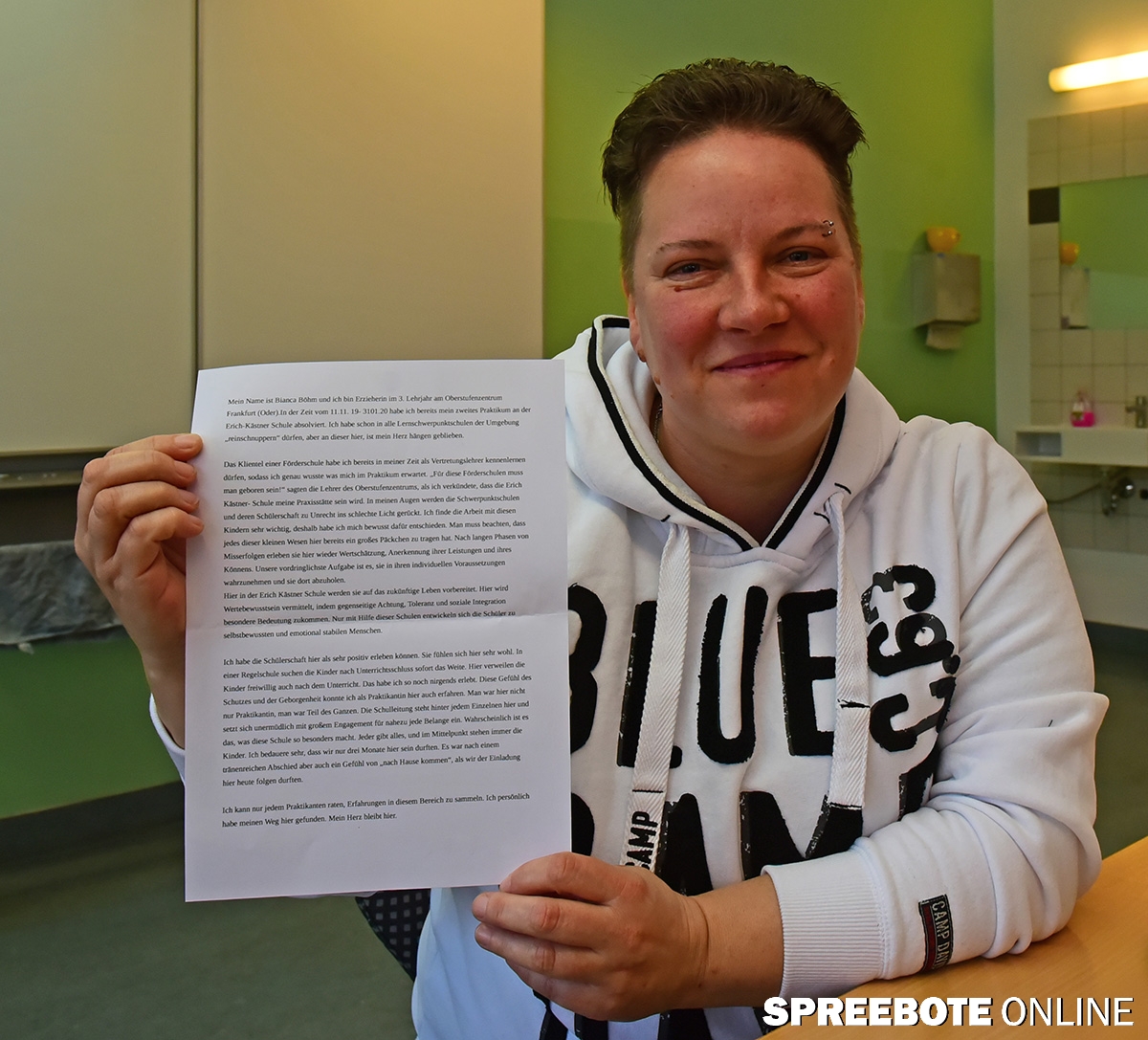Petra Schumann zeigte sich von dem großen Interesse von Auszubildenden verschiedener Sozialer Lehrberufe, die sich an der Erich-Kästner-Schule für ein Praktikum bewerben, sehr erfreut. Es war nicht immer so, man kannte das nur von dem heilpädagogischen Hort, der an die Schule angegliedert ist. Umso mehr engagiert man sich jetzt, nachdem man festgestellt hat, wie man auf beiden Seiten davon partizipieren kann. Vier junge Damen, die im unterschiedlichen Rhythmus die Schule und die Kinder begleiteten, erzählten lebhaft und blumig von ihren ersten Schritten, die zum Teil schwer und kompliziert waren. Alle waren sich einig, dass diese Schule etwas Besonderes ist und sie durch die Lehrer, die mit ihren Erfahrungen im Umgang mit den Kindern das Credo der Schule leben, viel gelernt haben. Der Abschied fiele besonders schwer, weil sie die Kinder doch ziemlich schnell ins Herz geschlossen haben. Das Öffnen auf beiden Seiten habe zum Gelingen der Praktika beigetragen. Emotional widergegeben hat das besonders Bianca, die sichtlich den Tränen nahe, alles aufgeschrieben hatte, was sie bewegte und vorlas. Soviel Herzlichkeit, Fingerspitzengefühl, jedem eine Chance gebend, so etwas habe sie noch nie so erlebt.