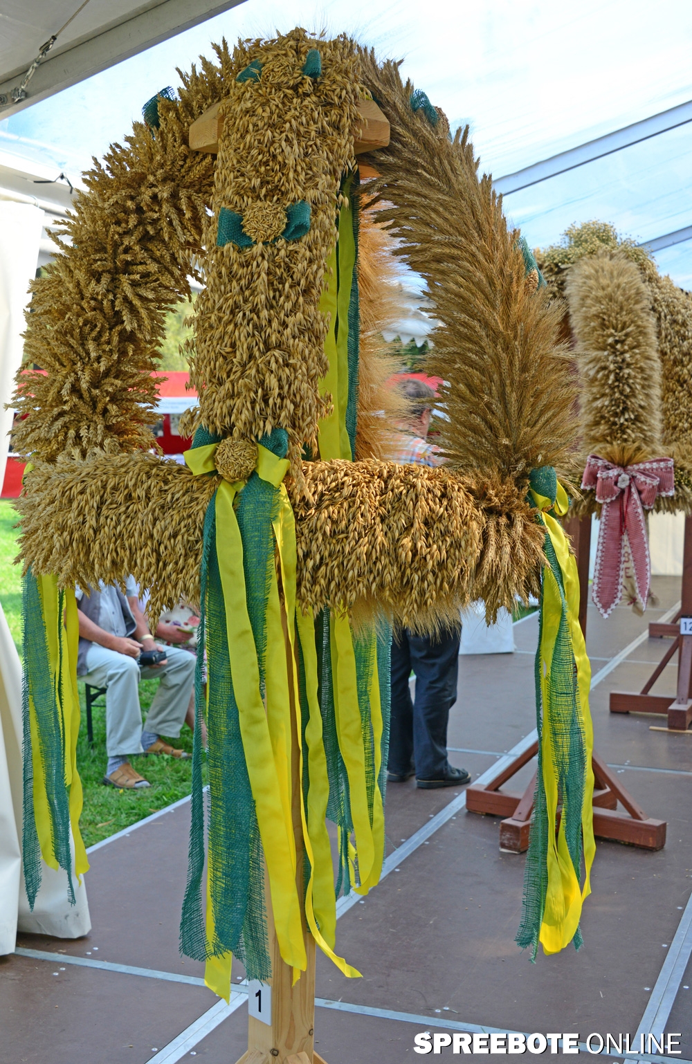 Die Siegerkrone der Interessengemeinschaft Pro Michelsdorf (Landkreis Potsdam-Mittelmark) wird im Landtag aufgestellt. Die Besonderheit: Das Kronenbinden ist hier in erster Linie Männersache, tatkräftig unterstützt von Frauen und Kindern. Die zweitplatzierte Krone der Ortsgruppe Falkenberg des Landfrauenvereins Oder-Spree, die auch der diesjährige Publikumssieger wurde, kann ab Montag im Foyer der Staatskanzlei bewundert werden. Das Gebinde der Ortsgruppe Weseram des Kreislandfrauenverbands Potsdam-Mittelmark, das den dritten Platz gewann, wird im Hauptgebäude des Agrar- und Umweltministeriums an der Henning-von-Tresckow-Straße zu sehen sein.