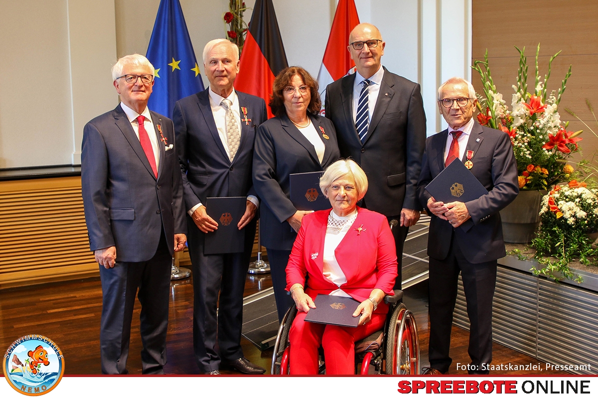 Ministerpräsident Dietmar Woidke hat im Namen von Bundespräsident Frank-Walter Steinmeier Bundesverdienstorden an fünf Persönlichkeiten überreicht, die sich in oder um das Land Brandenburg besonders verdient gemacht haben. Bei der feierlichen Aushändigung im Brandenburg-Saal der Potsdamer Staatskanzlei betonte Woidke in seiner Rede: „Jede und jeder von Ihnen hat eine unverwechselbare und beeindruckende Lebensgeschichte. Die Begegnung mit Ihnen macht stolz auf unser Land und alles, was wir – Zivilgesellschaft und Politik – gemeinsam erreicht haben. Ehrenamtlicher Einsatz findet in Brandenburg in allen Lebensbereichen statt und bewirkt enorm viel. Das Verbindende ist stets der uneigennützige Einsatz für das Gemeinwohl und zur Stärkung des Miteinanders. Sie alle haben andere für Ihre Projekte begeistert und zur Mitarbeit animiert. Deshalb will ich auch jenen danken, die Ihnen zur Seite stehen.