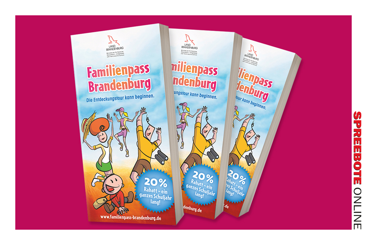 | Pünktlich zum Kindertag ist der neue Brandenburger Familienpass 2021/22 erschienen. Der beliebte Freizeit- und Ausflugsplaner erlebt seine inzwischen 16. Auflage und lockt ein Jahr lang mit Rabatten oder sogar freiem Eintritt für 407 Familienattraktionen in Brandenburg und Berlin. Der Familienpass wird jährlich vom Sozialministerium mit Unterstützung und von der Tourismus-Marketing Brandenburg GmbH herausgegeben. Insgesamt 40.000 Exemplare der 314 Seiten starken Broschüre wurden gedruckt. Der Familienpass ist vom 24. Juni bis 30. Juni 2022 gültig und gegen eine Schutzgebühr von 2,50 Euro seit dem 1. Juni der Kindertag, landesweit im Handel erhältlich.