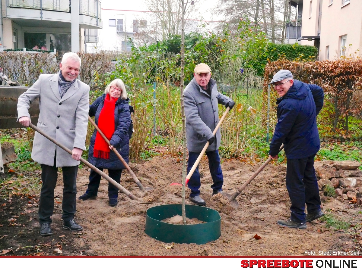 Anlässlich des 35-jährigen Bestehens des AWO-Ortsverbands Erkner wurde im Rathauspark eine Elsbeere gepflanzt. Gemeinsam griffen Christian Wende-Szepes (Geschäftsführender Vorstand des AWO-Kreisverbandes Fürstenwalde e. V., Hans-Peter Hendriks Vorsitzender des AWO-Ortsvereins Erkner, Sigrid Seiz-Hendriks Vorsitzende des Seniorenbeirats Erkner sowie Bürgermeister Henryk Pilz zur Schaufel und setzten den jungen Baum fachgerecht in die vorbereitete Pflanzgrube. Die Wahl fiel bewusst auf eine Elsbeere, ein heimisches Rosengewächs, das im Frühjahr zahlreiche Insekten anzieht und als wertvolle Bienenweide gilt. Über den Sommer entwickeln sich ihre roten Früchte, die erst nach dem ersten Frost ihre Süße entfalten, erklärte Christian Wende-Szepes. Im Herbst schmückt sich der ökologisch anspruchslose Tiefwurzler zudem mit einer eindrucksvollen rötlichen Laubfärbung ein künftiger Blickfang im Rathauspark.