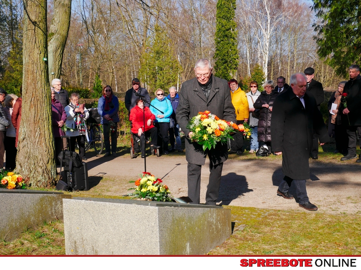 Zuvor hatte Hans-Peter Hendricks, der Vorsitzende des Heimatvereins Erkner e. V., in seiner Ansprache auf den Vortrag „30 Minuten bis zur Hölle – Der 08. März 1944“ vom Stadthistoriker Frank Retzlaff am Abend zuvor verwiesen. „Dieser Vortrag hängt in meinem Gedächtnis noch nach. Die schwarze Rauchwolke über Erkner, die auf einem gezeigten Foto zu sehen war, sehe ich noch immer vor meinem geistigen Auge. Carsten Schwarz und Hansjörg Blattner, die beiden Pfarrer der evangelischen und katholischen Kirchengemeinden, sprachen zum Abschluss dieser Kranzniederlegung das Versöhnungsgebet von Coventry mit den anwesenden Gästen.