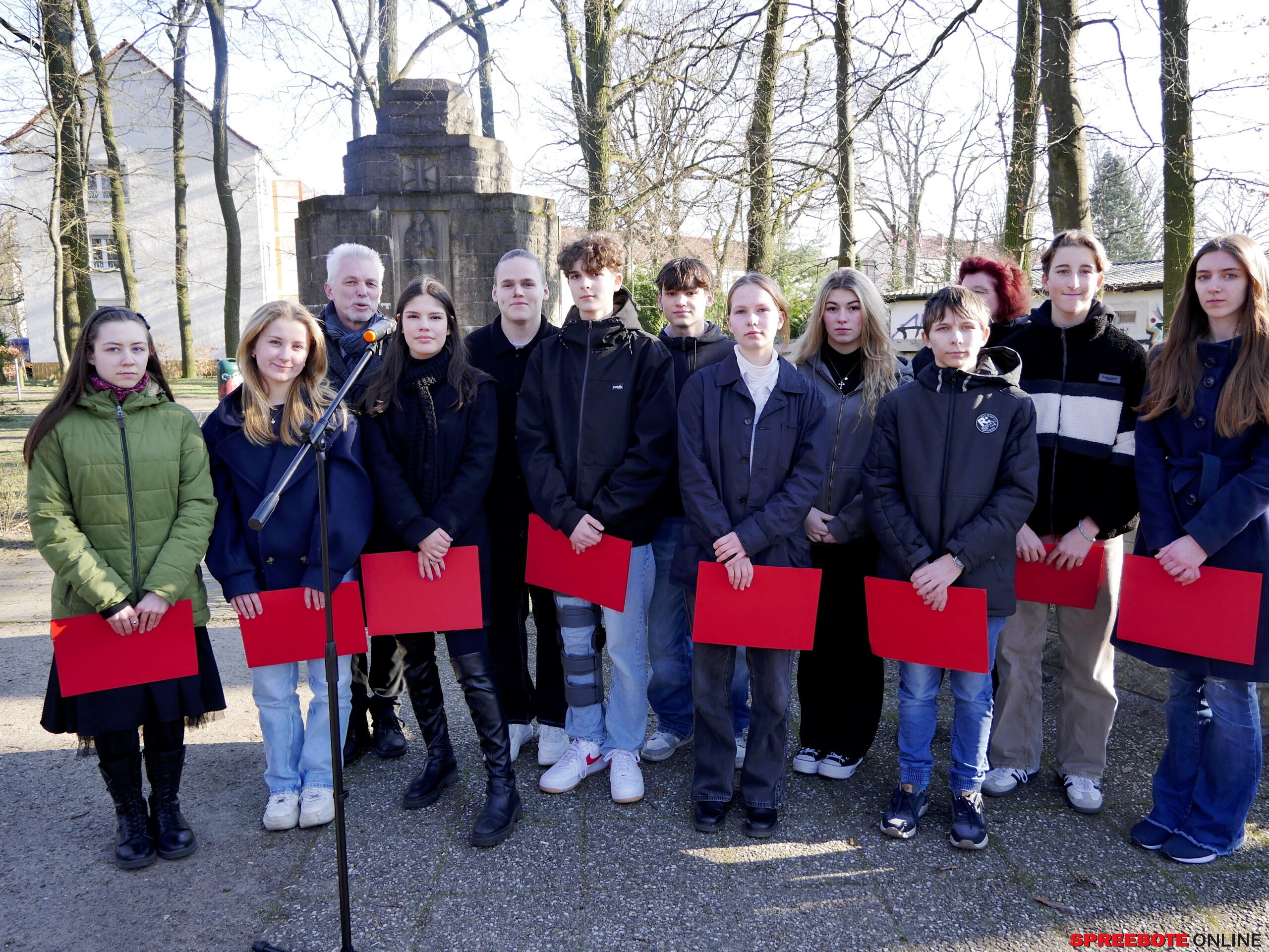 Bereits eine halbe Stunde später begann die zweite Kranzniederlegung an der Erinnerungsstätte der Stadt am Hohenbinder Weg / Neu Zittauer Straße. Gymnasiasten aus der 9L und der 11. Jahrgangsstufe des Carl-Bechstein-Gymnasiums wiesen in Redebeiträgen auf die sinnlosen Flächenbombardements der Alliierten hin und rezitierten Bertolt Brechts „Die Bitten der Kinder.“ Der Bürgermeister der Stadt Erkner Henryk Pilz erinnerte in seiner Rede an das unfassbare Leid der Zivilbevölkerung und an die Folgen der Bombardierung. An Wunden, die bis heute im Stadtbild zu sehen sind. Gedenkstätten wie diese, sind stumme Zeugen und sollen uns täglich mahnen, wachsam zu sein, um den Frieden zu ringen und Unschuldige zu schützen. Der Bürgermeister erinnerte nicht nur an den Ukraine-Krieg, sondern an die weltweit 200 gewaltsam ausgetragenen Konflikte… Nur wenn alle der Versuchung widerstehen, Krieg und Gewalt als Mittel zur Lösung von Interessensgegensätzen zu betrachten, werden wir einen Weg beschreiten können, der zur Hoffnung berechtigt, so Pilz weiter.