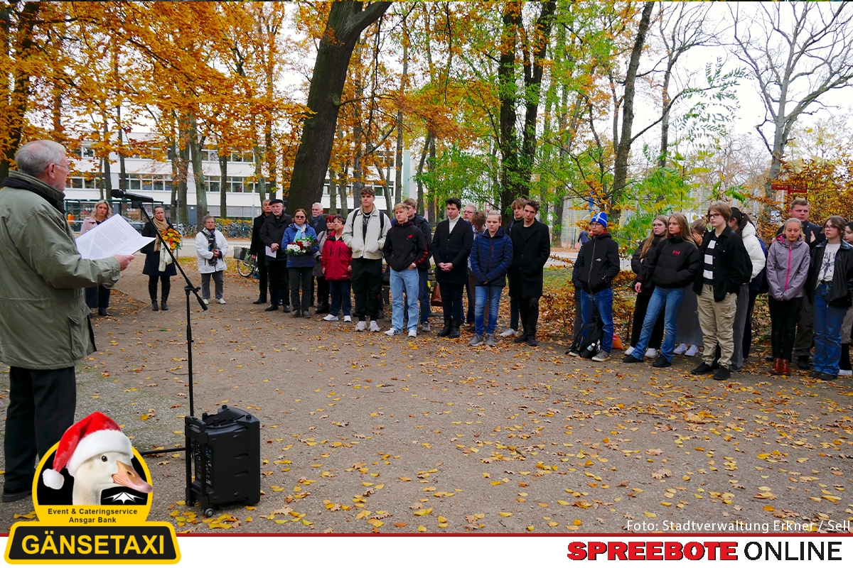 Der evangelische Pfarrer Carsten Schwarz mahnte an, wachsam zu sein, denn dieser 9. November ist ein Tag des Erinnerns und der Mahnung. Erkners Bürgermeister Henryk Pilz bedankte sich bei den Erschienenen für deren Teilnahme am Stillen Gedenken an der Erinnerungsstätte. Neben den Vertretern von Parteien, Verbänden und Unternehmen waren auch die Klasse 9 e und der Abitur-Leistungskurs in Politische Bildung aus dem Bechstein-Gymnasium zugegen. Das Stille Gedenken endete traditionell mit dem Versöhnungsgebt von Coventry.