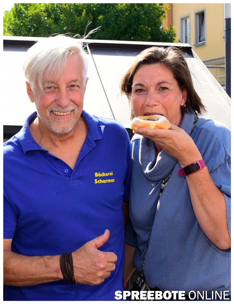 Wolfgang Scharmer, seines Zeichens Innungsobermeister, war ebenfalls mit dabei und zauberte mit seinem rollenden Holz-Backoffen frische Kirschbuchteln, die auf der Zunge aromatisch zergingen. Und in unmittelbarer Nähe hatte die Kulturbrennerei Streitberg ihre Zelte aufgeschlagen, mit Obstbränden aus eigener Produktion. Derweilen war die Bühne mit vielen Aktionen belegt: Das Tanzstudio „Miral“ präsentierte tänzerische Ideen aus der Gypsi-Szene, die „Fürstenwalder Stadtmusikanten“ brachten mit ihrer Musik die Menschen zusammen und Undine Lux sang sich mit Schlagern aus der eigenen Feder in die Herzen der Gäste. Und der Regionalist und Marktchef des Festes, Bernd Norkeweit, moderierte nicht nur den gesamten Tag, sondern begleitete und unterstützte „seine“ regionalen Markthändler, die ihm mit Begeisterung von diesem tollen Tag des Geschehens berichteten. Das ist natürlich Bestätigung und Dank, dass sich der Aufwand gelohnt hat, solch eine Festivität glanzvoll umzusetzen – und dabei noch mit sage und schreibe 30.000 Schritten die eigene Gesundheit gefördert zu haben. Im Schnitt waren den gesamten Tag über 850 Gäste vor Ort, die das Fest in vollen Zügen genossen. In der Galerie der Stadt, im Alten Rathaus, fand dann am frühen Nachmittag dazu noch eine Ausstellungseröffnung statt, die sich vor interessierten Besuchern kaum retten konnte. Ein großes Lob für die Sicherheit geht ganz klar an die „Security Company“, die an den Ein- und Ausgängen eine gute Arbeit gemacht hat.