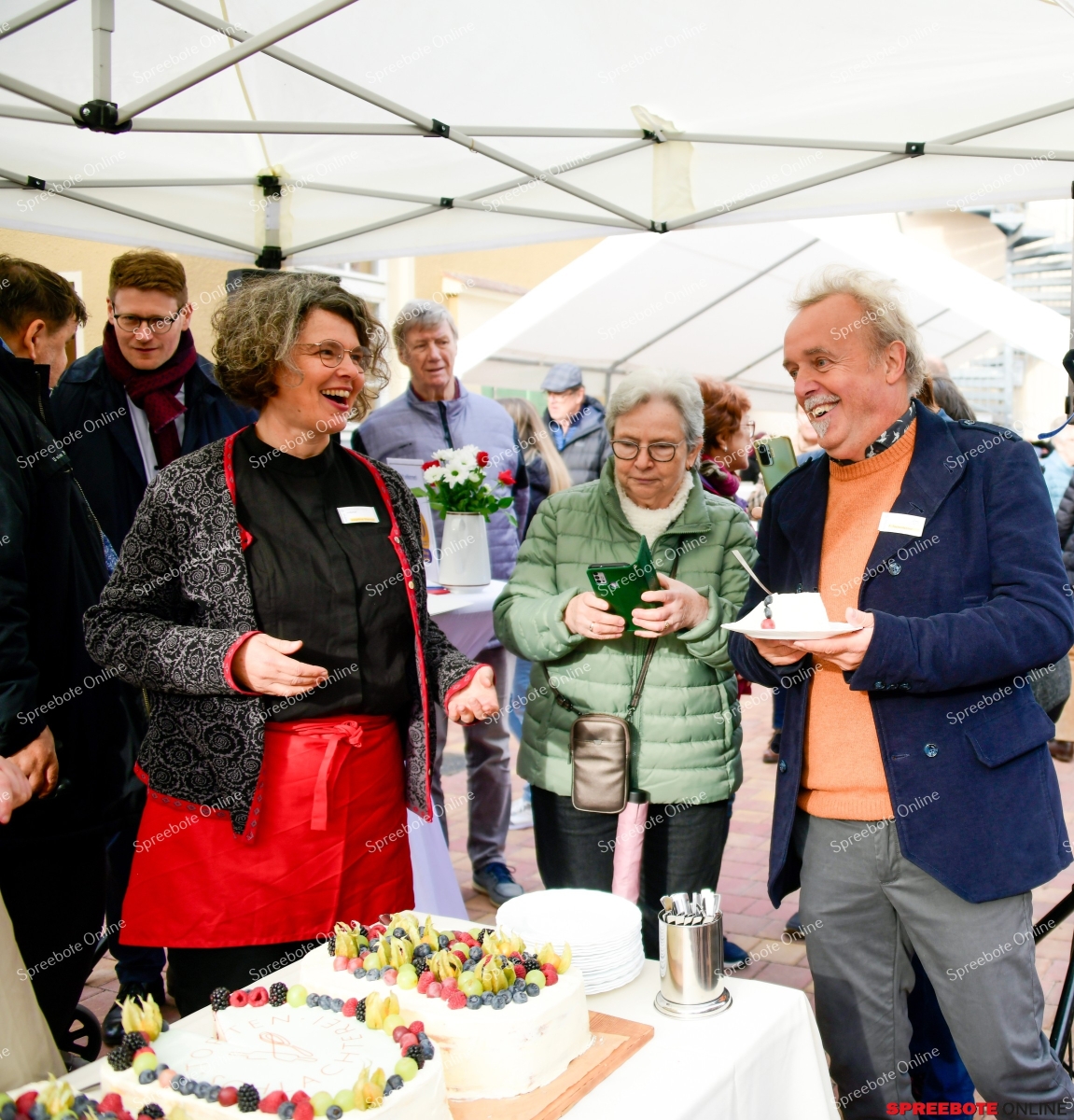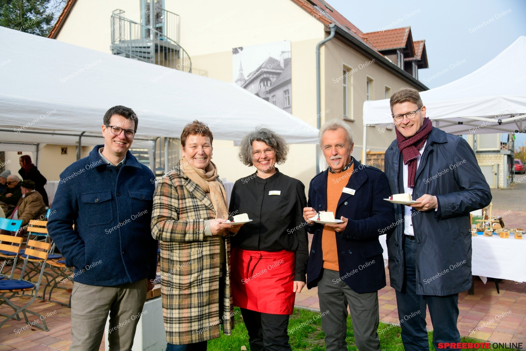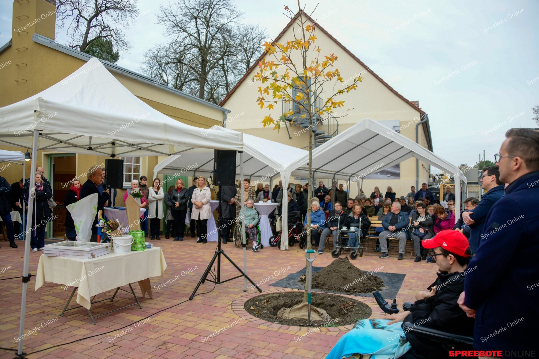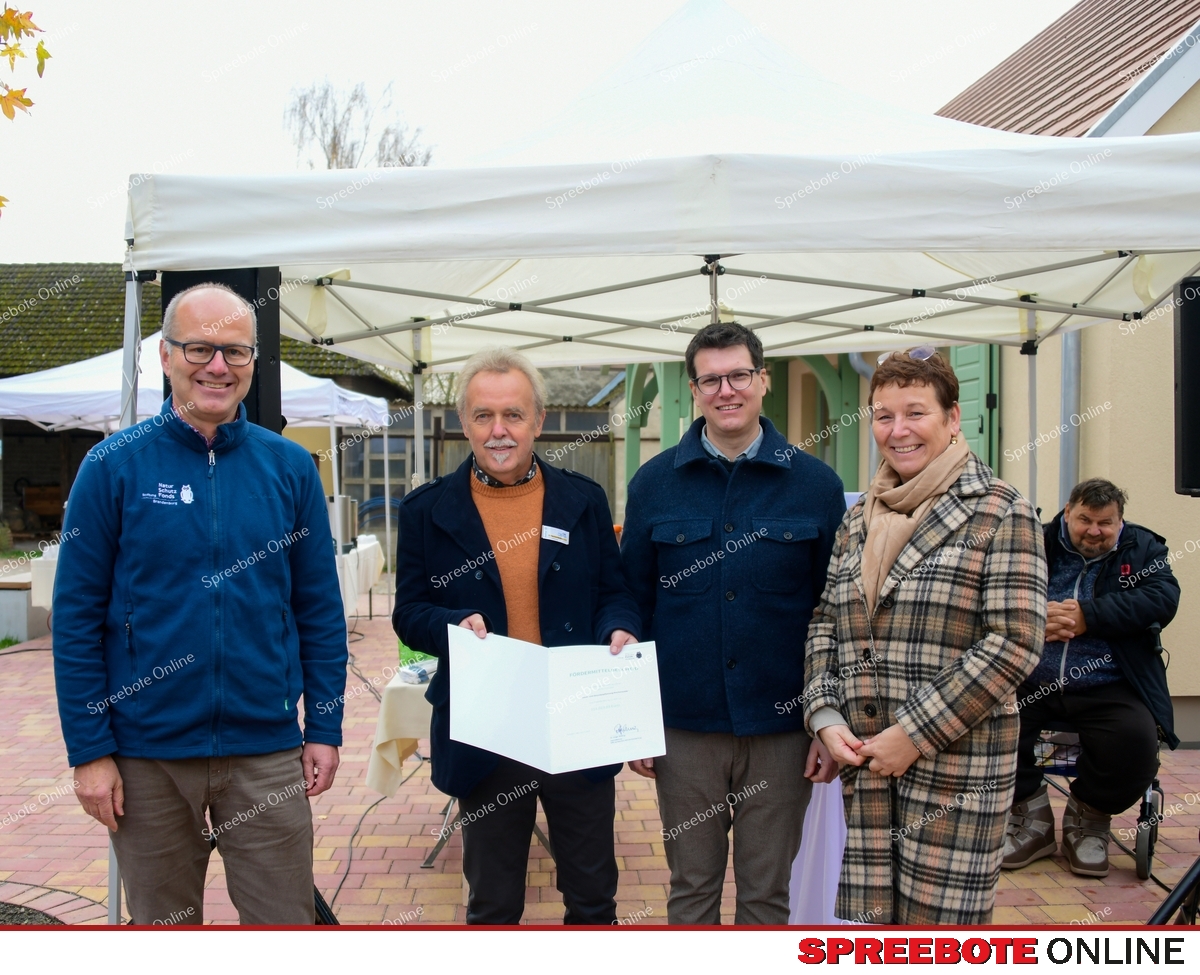 Viele herzliche Worte zur Eröffnung von den Gestaltern, Wegbegleitern und der Stiftung brachten zum Ausdruck, wie viel mehr dieser Ort im Eigentlichen ist ein Ort, der Gemeinschaft, Hoffnung und Nächstenliebe spürbar macht und was er in der Zukunft für alle, die ihn betreten, schenken wird. Zu den Gästen zählte Dr. Holger Rößling, Geschäftsführer des NaturSchutzFonds Brandenburg. Er kam eigens zur Eröffnung des Cafés „Tortenschlachterei“ und überreichte den Fördermittelbescheid für die Pflanzung von 100 Bäumen. Es soll eine Pflanzung für die Zukunft sein, für die Umgebungsgestaltung und vor allem für schattige Plätze. Mit diesen Pflanzungen wird diesem Anliegen entsprochen, so Johannes Mai und Frank Tschentscher. Man wolle eine Streuobstwiese anlegen, damit ein Kreislauf erlebbar werde, wir pflanzen das Obst für die Obsttorten und für vieles mehr. Großer Beifall folgte. Gemeinsam wurde vor dem Café als Symbol ein Baum gepflanzt, der den derzeitigen Umweltbedingungen standhalten wird und eine prachtvolle, schattenspendende Krone entwickeln soll ein Baum, der den Platz der Einkehr für Gäste in eine warme, einladende Atmosphäre taucht.