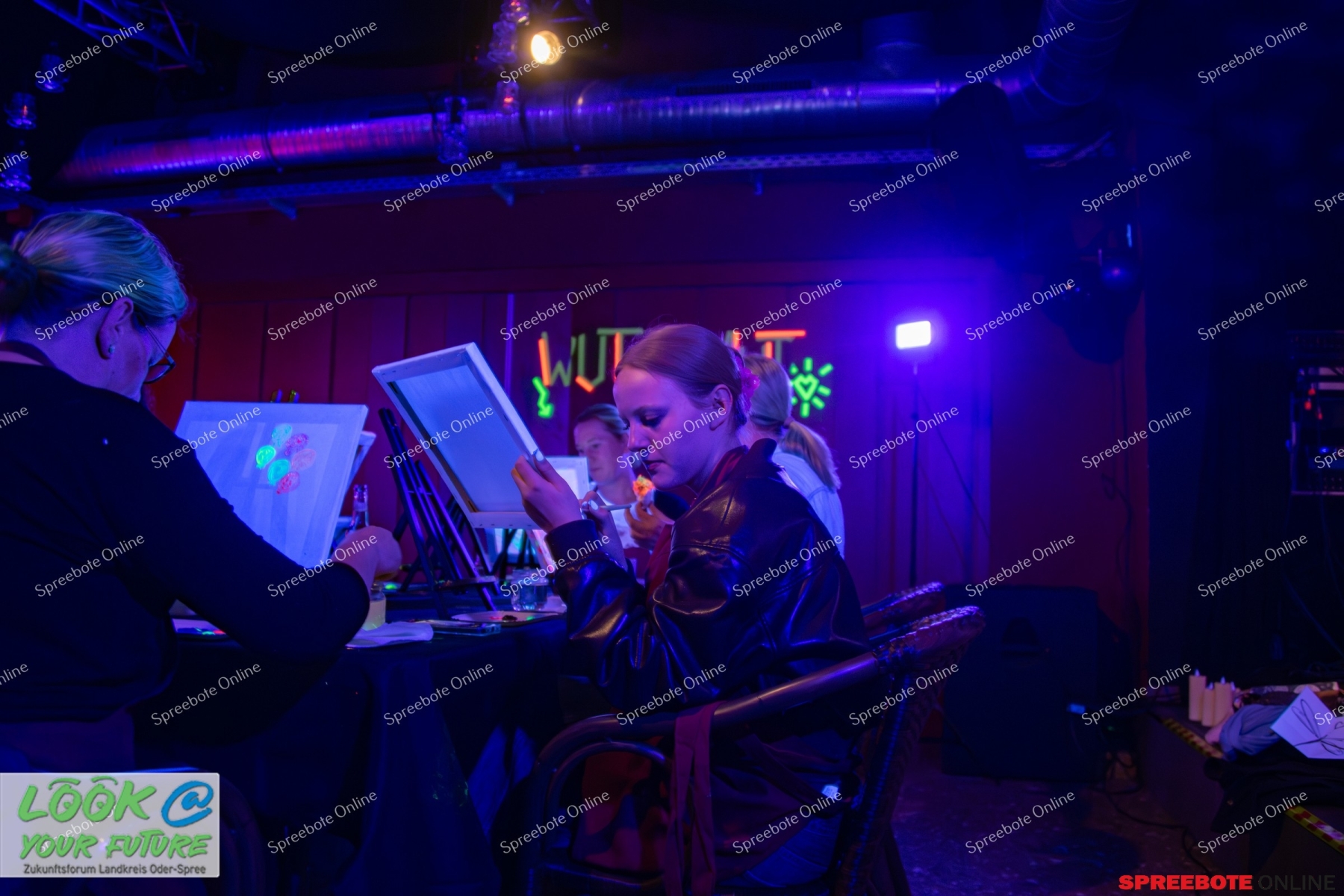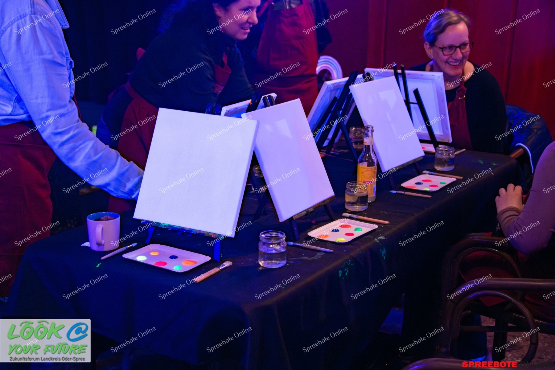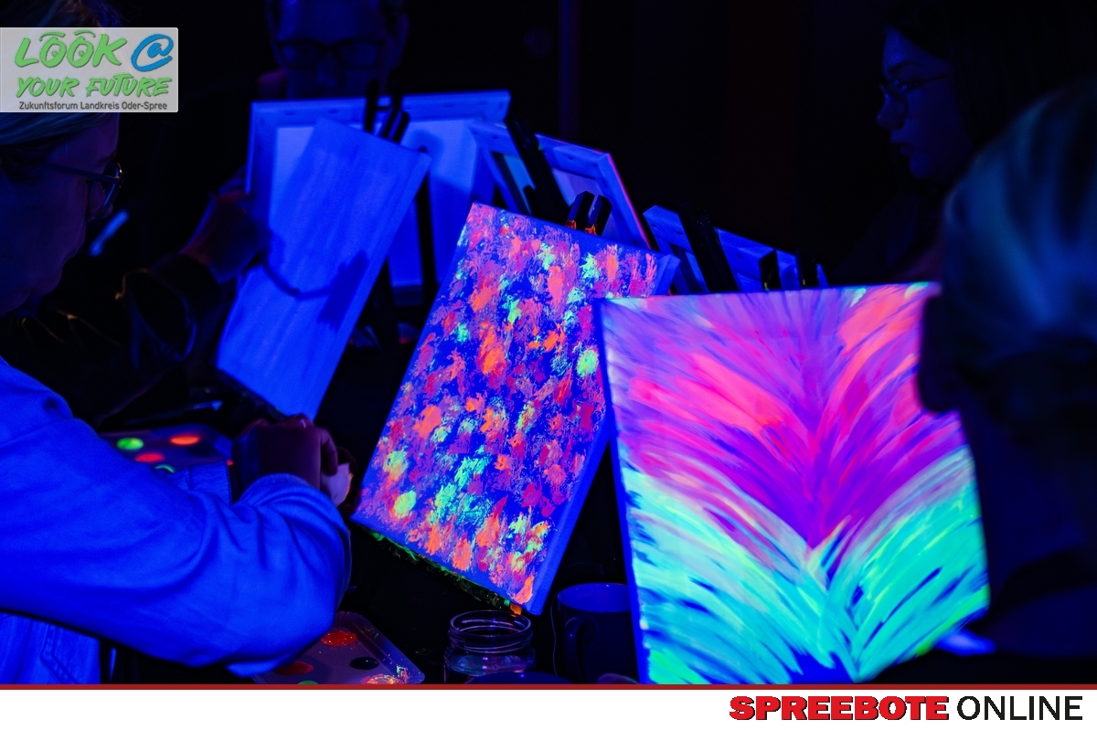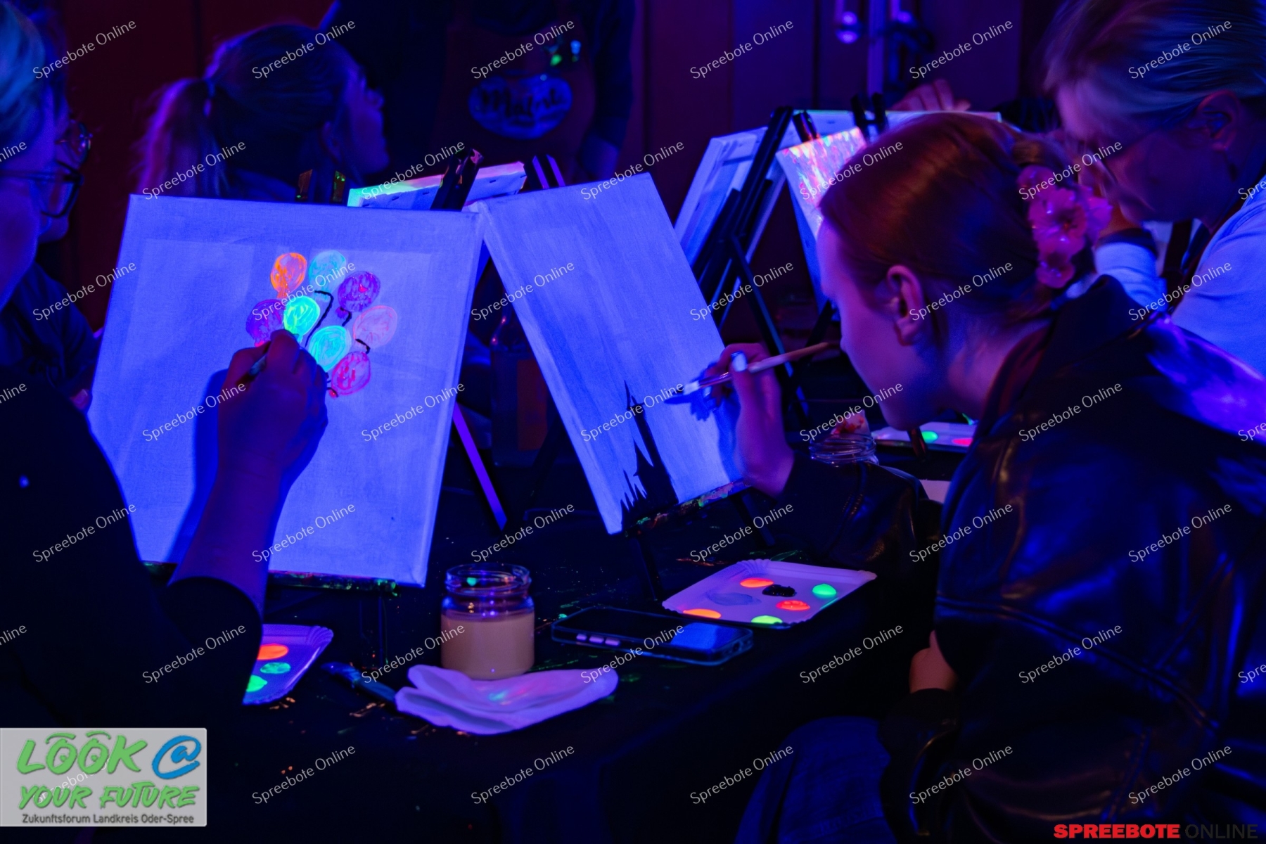 Ebenfalls großes Interesse fand die „Schwarzlichtmalerei“ mit Kathrin Gehrke-Wenzek. Die Teilnehmenden kamen mit ganz unterschiedlichen Erwartungen und Erfahrungen. Einige hatten bereits eine Idee oder sogar eine Skizze im Kopf, andere wollten sich einfach inspirieren lassen beides war ausdrücklich willkommen, betonte Kathrin Gehrke-Wenzek. Bei Fragen oder Unsicherheiten konnten sich alle jederzeit an sie wenden. Als Inspiration nannte sie Motive, die sich besonders gut für die verwendeten Farben eignen, vor allem alles, was leuchtet. Beispielsweise Unterwasserwelten mit Korallenriffen oder Quallen, magische Bäume, Galaxien mit Planeten und Sternbildern oder auch Nordlichter. Die Farben konnten direkt verwendet werden und mussten nicht verdünnt werden. Wasser stand dennoch bereit, um die Pinsel zu reinigen oder die Farben bewusst zu verdünnen und verlaufen zu lassen, was schöne Effekte erzeugen kann. Da die Farben eher lasierend sind, schimmern darunterliegende Schichten leicht durch. Nur Schwarz deckt stärker, Schwarz und Weiß wurden bei Bedarf verteilt. Bei Musik geht eben alles auch etwas leichter. Dabei entstanden kleine Meisterwerke mit viel Fantasie. Auch die Techniken waren nicht immer dieselben man muss die Farbe ja nicht nur mit dem Pinsel auftragen. Es gibt viele Möglichkeiten: tupfen, Verläufe gestalten und vieles mehr. Ein Kreativabend, wie er im Bilderbuch steht.