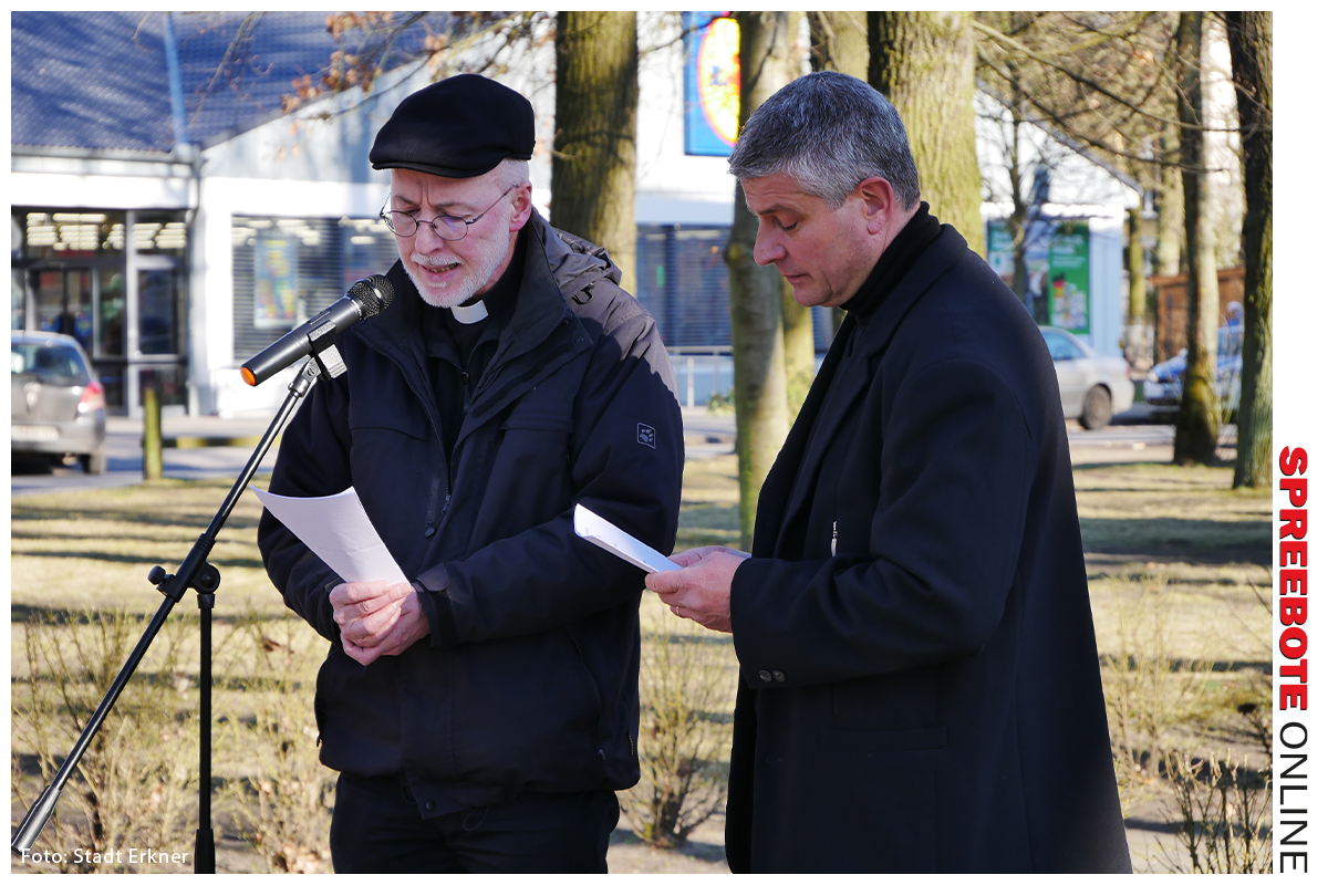 Von einst 1333 Häusern in Erkner waren 1007 Gebäude zerstört. Unvorstellbar heute, denn Erkner ist wieder aufgebaut. Unvorstellbar auch, weil vor kurzer Zeit das Leben für die Menschen in der Ukraine genauso normal verlief, wie das unsere heute. Oder doch nicht ganz…? Dass auch unser Leben nicht so unbelastet weiterläuft, dies machten vor allem die beiden Pfarrer Hansjörg Blattner und Carsten Schwarz deutlich. Kiew liegt von Erkner ca. 1300 Kilometer entfernt. Es herrscht auf einmal wieder Krieg in Europa. Erschreckend nah. „Unsere Gedanken sind heute anders als noch vor zwei Wochen. Ängste gibt es auch bei uns, aber eben auch eine enorm große Hilfsbereitschaft“, so Carsten Schwarz. An der Erinnerungsstätte am Hohenbinder Weg / Ecke Neu Zittauer Straße verlas Lothar Eysser, der Vorsitzende der Stadtverordnetenversammlung, das Gedicht „Tod von Erkner“. Die beiden Pfarrer Blattner und Schwarz verlasen aus aktuellem Anlass das Ökumenische Friedensgebt dieses Jahres, welches aus Kenia stammt, und fügten diesem Gebet aktuelle Gedanken zur Ukraine bei.