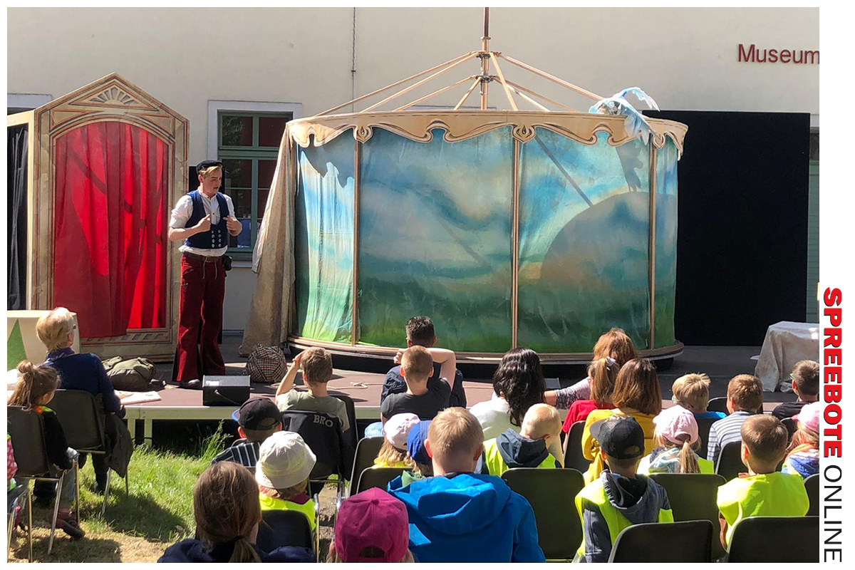 Der Kindertag ist einer der schönsten Tage für Kinder, denn an diesem Tag stehen sie im Mittelpunkt des Geschehens. Dazu hat die Kulturfabrik in Fürstenwalde ihre jungen Fans bereits am Vortag zur Preview, also zur Vorpremiere eingeladen. Die Uckermärkischen Bühnen Schwedt waren mit ihrem neuen Stück „Hans im Glück“ gekommen. Dazu hatte die Crew der Kulturfabrik für die Kinder den Museumsvorplatz in ein zauberhaftes Open-Air-Theaterareal umgebaut, so dass die Kinder aus allen Richtungen einen super Rundumblick hatten. 170 Kinder – das war schon eine ganz schöne Herausforderung, sie alle zu platzieren und bei Stimmung zu halten, da es anfangs noch ein paar kleine, aber schnell gelöste Probleme gab. Hans erhält als Lohn für sieben Jahre tüchtige Arbeit einen großen Klumpen Gold. Der ist allerdings ganz schön schwer … Wie gut, dass der Schmied ihm sein Pferd im Tausch gegen den Goldklumpen anbietet. Moment! Das ganze Gold für nur ein Pferd? Das zumindest denkt sich der Schmied, besonders, da er sich auf weitere Tauschgeschäfte mit Hans einlässt. Aus denen geht der Schmied stets reicher hervor als Hans, doch er wird immer unglücklicher, je weniger Hans sich selbst als Verlierer der Geschäfte begreift. Hans hingegen wird mit jedem Handel glücklicher – das kann doch nicht mit rechten Dingen zugehen?