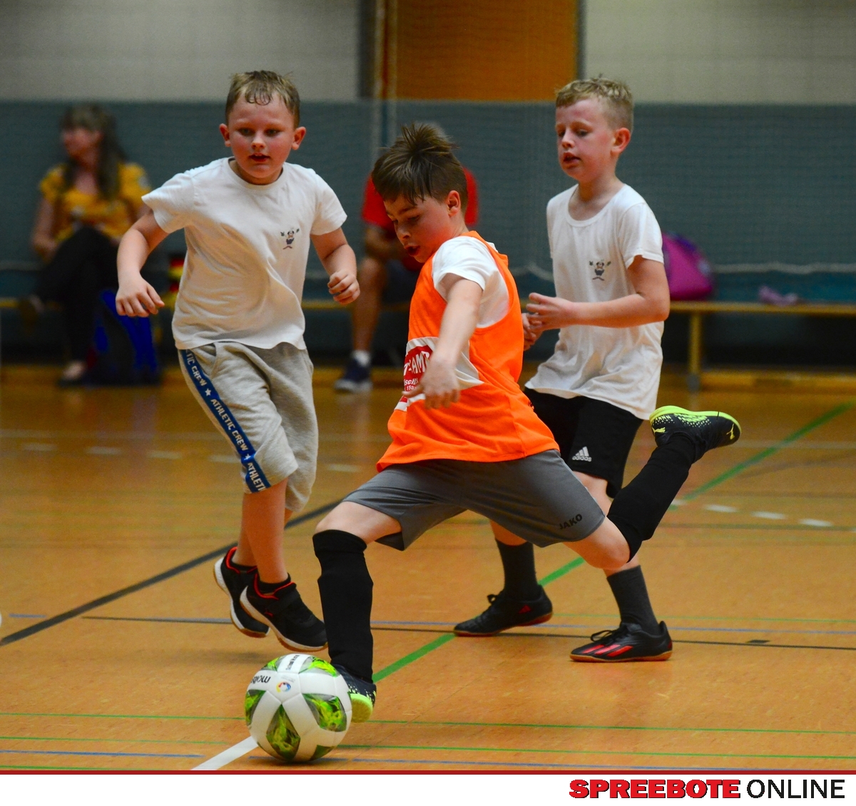 Kathleen Spiller, Erzieherin im Hort Abenteuerland, hat die Cheforganisation des „Fußballturnier der Horte“ übernommen und dabei große Unterstützung durch das Kollegium und besonders durch die Eltern bekommen. Zwei Monate Vorbereitungszeit waren denkbar knapp, aber es hat sich wirklich gelohnt – zur Freude der Kinder. Insgesamt waren 55 fußballbegeisterte Kids im Alter zwischen sechs und zehn Jahren am Start. Sie kamen aus den vier Horten Spreefüchse, Wirbelwind, Kunterbunt und dem Hort Abenteuerland. Es gibt noch einen fünften Hort der Stadt Fürstenwalde, den Hort „Sternschnuppe“, aber dieser hatte leider keine Möglichkeit, daran teilzunehmen. Dann eben im nächsten Jahr. Die Spielzeit in dem Turnier in den K.O. Runden betrug 2×4 Minuten und sie spielten in ihren Teams mit sieben Feldspielern und einem Torwart. Einige Teams hatten, wie in den Ligen üblich, einheitliche Mannschaftstrikots. Das war nicht bei allen unbedingt ausschlaggebend, für viele reichte ein T-Shirt und eine Turnhose, um mit viel Lust und Spaß am Turnier teilzunehmen. Und sie hatten ihren Spaß, ein Bild von lustigen Kids die quer durch die Halle flitzten, um den Ball gegen den Ansturm der Vielen zu behaupten, um ein Tor zu schießen, das frenetische Feiern des Schützen inklusive. Für die Energie der Kinder gab es im Foyer der Edis Sporthalle ein Obst- und Gemüse-Buffet mit allerlei kinderfreundlichen Snacks. Nach der Gruppenphase folgte das Halbfinale und das Finale, was stark umkämpft war. Jedes Kind bekam eine Urkunde überreicht und die Pokale. Nebst Wanderpokal die ersten drei Teams auf den jeweiligen Podiumsplätzen: