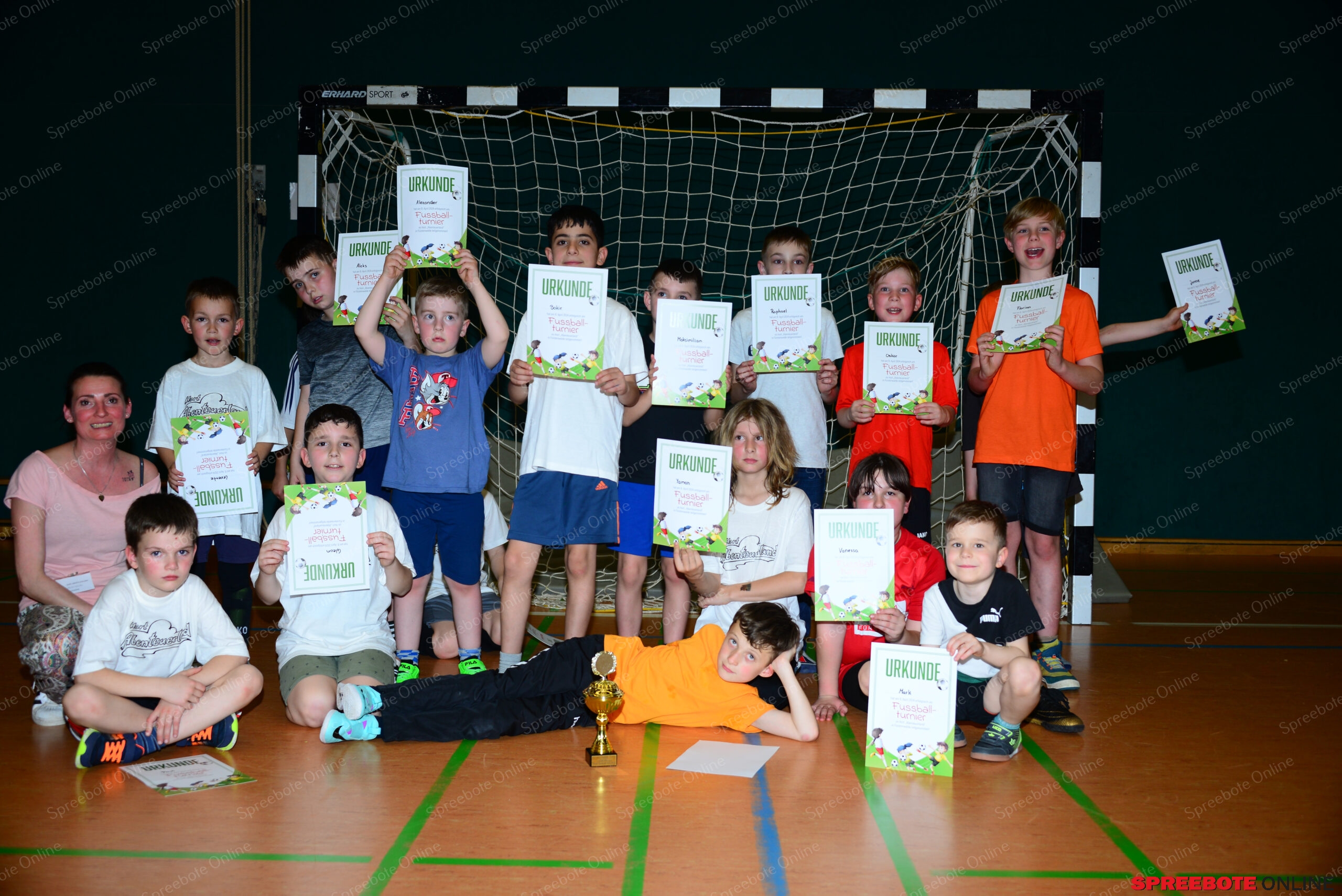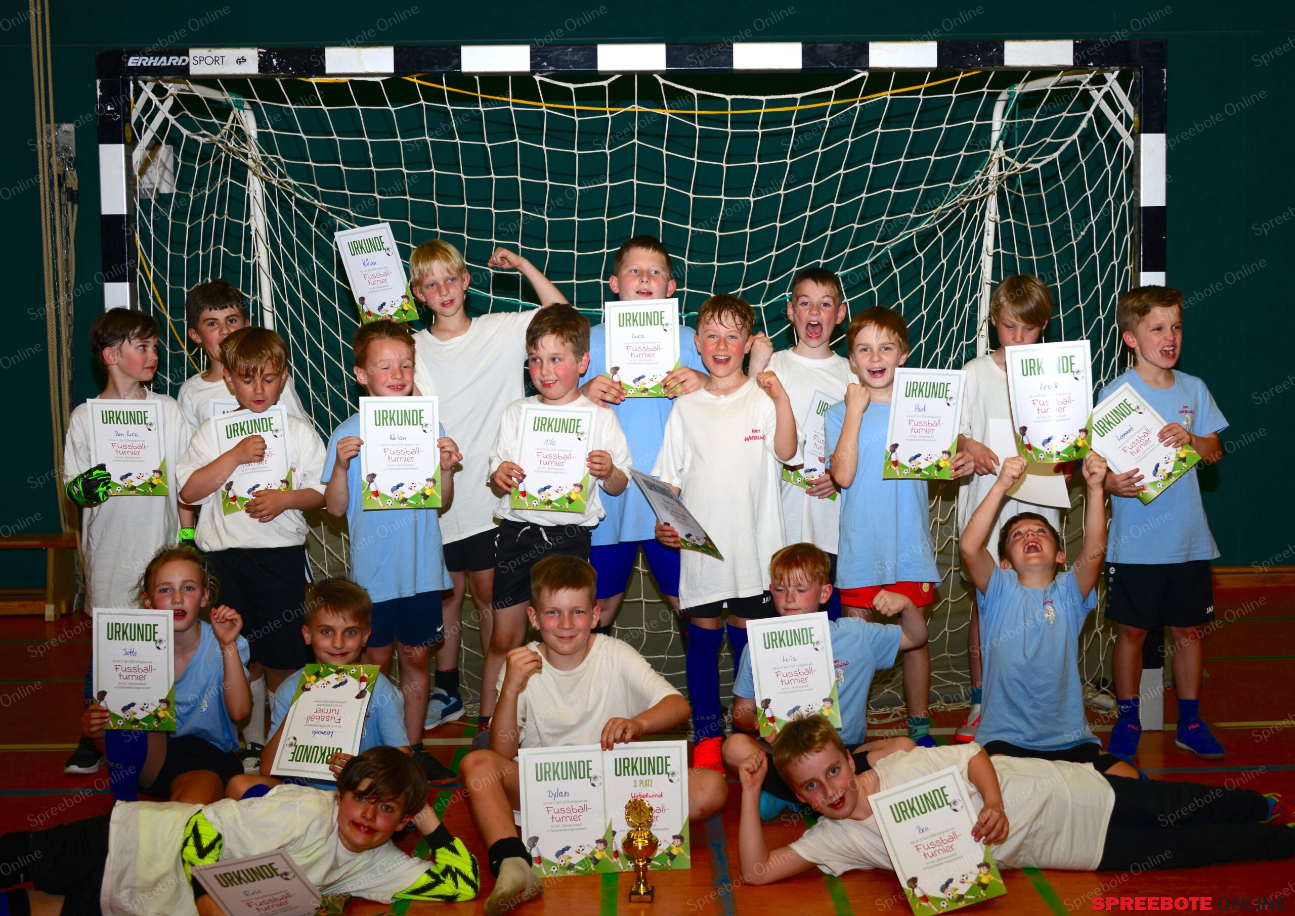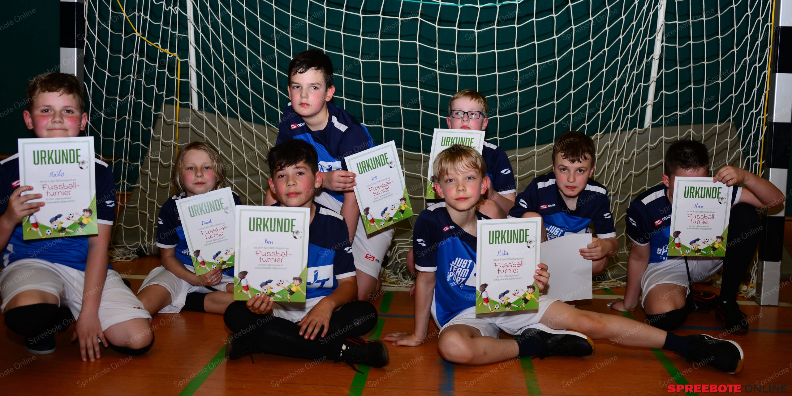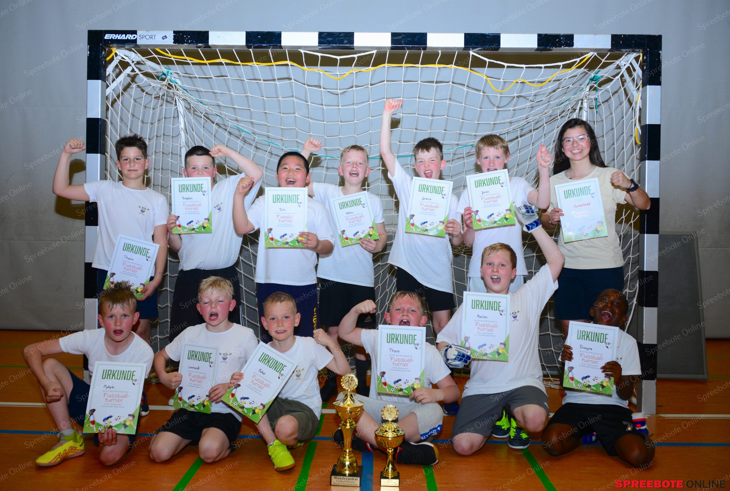 Kathleen Spiller, Erzieherin im Hort Abenteuerland, hat die Cheforganisation des „Fußballturnier der Horte“ übernommen und dabei große Unterstützung durch das Kollegium und besonders durch die Eltern bekommen. Zwei Monate Vorbereitungszeit waren denkbar knapp, aber es hat sich wirklich gelohnt – zur Freude der Kinder. Insgesamt waren 55 fußballbegeisterte Kids im Alter zwischen sechs und zehn Jahren am Start. Sie kamen aus den vier Horten Spreefüchse, Wirbelwind, Kunterbunt und dem Hort Abenteuerland. Es gibt noch einen fünften Hort der Stadt Fürstenwalde, den Hort „Sternschnuppe“, aber dieser hatte leider keine Möglichkeit, daran teilzunehmen. Dann eben im nächsten Jahr. Die Spielzeit in dem Turnier in den K.O. Runden betrug 2×4 Minuten und sie spielten in ihren Teams mit sieben Feldspielern und einem Torwart. Einige Teams hatten, wie in den Ligen üblich, einheitliche Mannschaftstrikots. Das war nicht bei allen unbedingt ausschlaggebend, für viele reichte ein T-Shirt und eine Turnhose, um mit viel Lust und Spaß am Turnier teilzunehmen. Und sie hatten ihren Spaß, ein Bild von lustigen Kids die quer durch die Halle flitzten, um den Ball gegen den Ansturm der Vielen zu behaupten, um ein Tor zu schießen, das frenetische Feiern des Schützen inklusive. Für die Energie der Kinder gab es im Foyer der Edis Sporthalle ein Obst- und Gemüse-Buffet mit allerlei kinderfreundlichen Snacks. Nach der Gruppenphase folgte das Halbfinale und das Finale, was stark umkämpft war. Jedes Kind bekam eine Urkunde überreicht und die Pokale. Nebst Wanderpokal die ersten drei Teams auf den jeweiligen Podiumsplätzen: