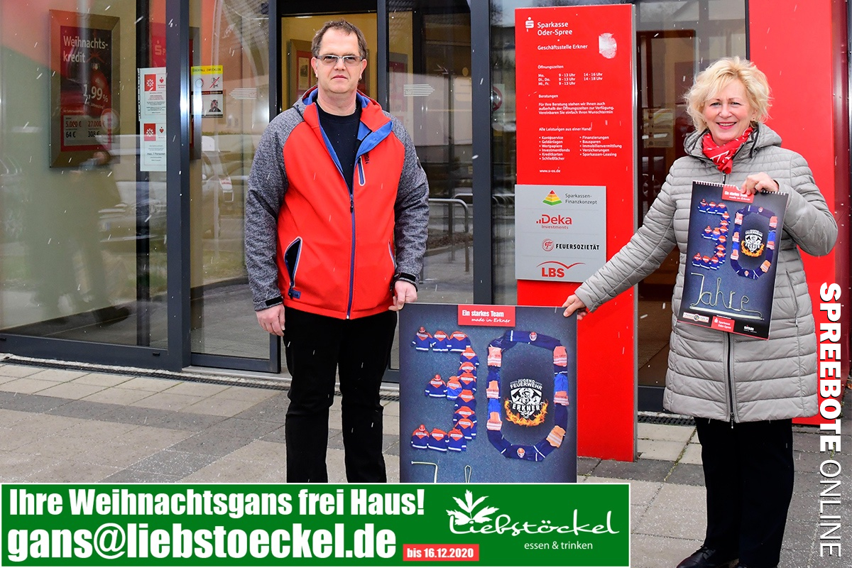 | Die Jugendfeuerwehr der Freiwilligen Feuerwehr Erkner begeht im kommenden Jahr ihr 30. Gründungsjubiläum. Vor diesem Hintergrund wurde für das Jahr 2021 ein Kalender kreiert, den der stellvertretende Vorsitzende des „Förderverein Freiwillige Feuerwehr Erkner e.V.“, Rene Meinel, heute in Erkner bei der Sparkasse Oder-Spree erstmals präsentierte. Als Dank für die Unterstützung des Vorhabens mit einer Spende aus dem PS-Zweckertrag in Höhe von 1.000,00 Euro überreichten die Vereinsvorstände ihrer Kundenbetreuerin bei der Sparkasse Oder-Spree, Birgitt Köckeritz, sowie der Leiterin der Sparkassenfiliale in Erkner, Liane Detert, je ein Exemplar des Kalenders. Die Spendenmittel wurden für den Druck des Kalenders eingesetzt, der in einer Auflage von 500 Stück erscheint. Die Freiwillige Feuerwehr wurde am 6. Dezember 1889 gegründet.