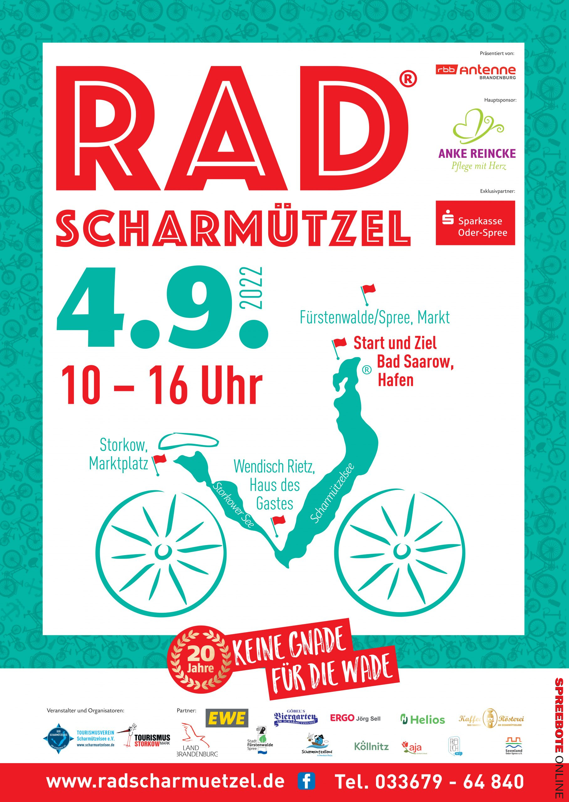 Nach zwei Jahren Pause stehen wir in den Startlöchern und freuen uns auf viele Radler, die gemeinsam auf Stempeljagd in der Region rund um den Scharmützelsee und den Storkower See gehen. Offiziell eröffnet wird das 20. Rad-Scharmützel in Bad Saarow um 9.30 Uhr mit Frühsport und Trommelwirbel. Hier begrüßen wir auch das Team „Anke Reincke – Pflege mit Herz“, unseren diesjährigen Titelsponsor. Vielen Dank für die großartige Unterstützung. Exklusiv zum Sparkassen- und Rad-Scharmützel-Jubiläum sponsert die Sparkasse Oder-Spree am Start in Bad Saarow Sattelschutzbezüge aus recyceltem PET – solange der Vorrat reicht. An dieser Stelle auch ein Dankeschön für 20 Jahre Unterstützung unserer Veranstaltung! Von Bad Saarow aus können die Radler unseren 6 Routenvorschlägen folgen oder ihre ganz individuelle Tour starten. 22 Stempelstellen, an denen mit Unterhaltung, Live-Musik und Gastronomie ihre wohlverdiente Radler-Pause in eine echte Sause verwandelt wird, sind in diesem Jahr mit dabei. Die Teilnahme an der Veranstaltung ist kostenfrei! Gern können Sie die Veranstaltung mit einem freiwilligen Beitrag unterstützen – hierzu stehen große Boxen an einigen Stempelstellen. Allen freiwilligen Helfern, Stempelhelden, Ordnern und Orga- und Stempelstellenpartnern an dieser Stelle auch ein großes DANKESCHÖN für das tolle Engagement und den Einsatz für unser gemeinsames Rad-Scharmützel. Wir wünschen uns allen Sonnenschein, unfallfreie Fahrt und einen tollen Radlertag in der Region rund um den Scharmützelsee und den Storkower See und Umgebung. Neben dem Pflegedienst Anke Reincke und der Sparkasse möchten wir uns beim Land Brandenburg, der EWE, der Stadt Fürstenwalde, dem Biergarten Göbel, der ArtProjekt Entwicklungen GmbH, dem Helios-Klinikum, der KaffeeRösterei Bad Saarow, der ERGO J. Sell, dem Scharmuntzelland und dem aja Resort Bad Saarow für die Unterstützung der Veranstaltung bedanken.