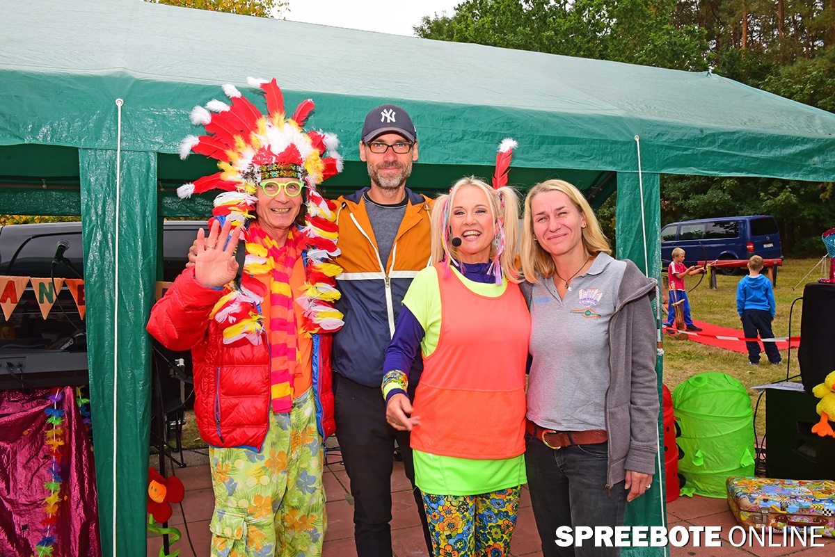 Das traditionelle Kiez-Kinderfest im Paul-Frost-Ring ist in jedem Jahr das kulturelle Highlight. Die Gemeinschaft stellt dazu alles Mögliche auf die Beine, um den Kindern einen unvergesslichen Tag des Spiels und des Spaßes zu bereiten. Entscheidend ist da natürlich Paule 49, in Persona Ivette und Andreas, die Leiterpersönlichkeiten des Treffs. Sie sind es, die das Fest zusammen inhaltlich konzipieren. In diesem Jahr war das Motto „Indianer“ angesagt – mit Tipi und vielem mehr. Zu den festen Partnern, die immer wiederkommen und das schon seit längerem, gehört zum Beispiel die Freiwillige Feuerwehr der Gemeinde Steinhöfel, die den Kindern im Geschicklichkeitstreffen mit der Spritzdüse zeigen, wie es geht. Dazu kommen die beiden Entertainer Max & Tini, die das Motto mit aufgriffen und mit viel Musik und Spielen fröhliche Kinder mit leuchtenden Augen zauberten. Wackelburg und Kinderschminken standen ebenso hoch im Kurs wie das Erklimmen der Baumwipfel beim Klettern mit JuSeV. Basteln, Bogenschießen und Reiten waren ebenfalls sehr gefragt, und obendrein gab‘s auch noch Eis und Hotdogs für die Kids und Kaffee für die Eltern.