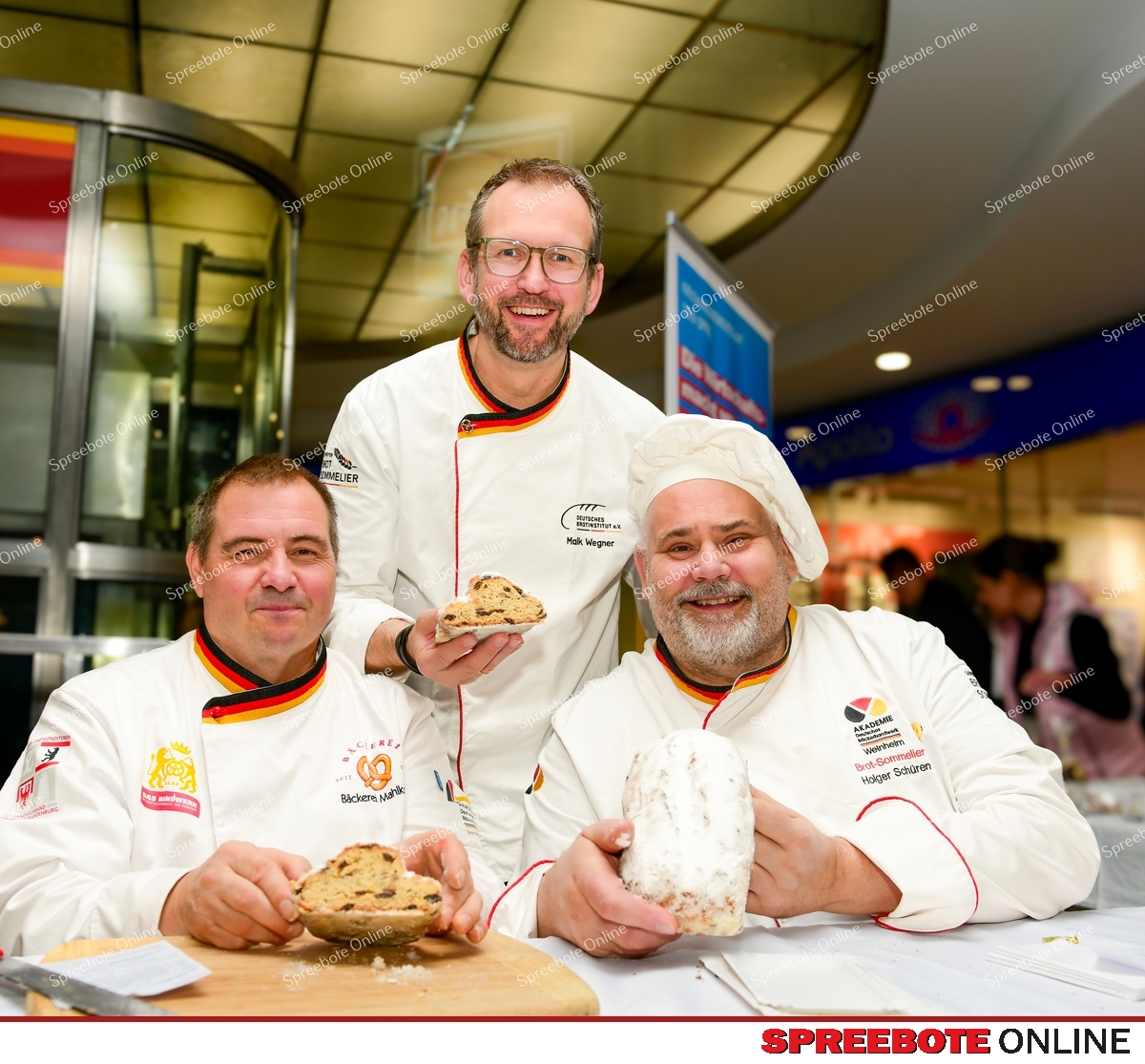 Bäckerei und Konditorei Friedrich, Bäckerei – Konditorei Vetter, Bäckerei Mahlkow, Bäckerei Scharmer, Bäcker und Konditorei Schüren, Bäckerei Zimmermann, stellten sich der Stollenprüfung. Maik Wagner vom Deutschen Brotinstitut e.V., Innungsobermeister Uwe Mahlkow und Brot-Sommelier Holger Schüren hatten die Qual der Wahl. 25 Stollen verschiedenster Geschmäcker standen unter den gestrengen Augen der Prüfer, sei es Mohnstollen, Meisterstollen, Cranberrystollen, Persipanstollen, Mandelstollen oder Rosinenstollen, um nur einige zu nennen. Hinzu kamen verschiedene Gebäcke zur Weihnachtszeit und Dominosteine. Bei einer Stollenprüfung achtet man auf mehrere zentrale Kriterien, um die Qualität der Stollen zu beurteilen. Zunächst fällt das Aussehen ins Auge, der Stollen sollte eine gleichmäßige Form besitzen, eine schöne Farbe haben und eine glatte Oberfläche ohne Risse aufweisen. Auch die Konsistenz spielt eine Rolle das Gebäck muss locker und saftig sein, weder trocken noch zu fest. Darüber hinaus wird der Geruch geprüft: Er sollte angenehm und typisch nach Butter, Hefe, Gewürzen und Früchten riechen. Ebenso wichtig ist der Geschmack, der harmonisch und ausgewogen zwischen Süße, Gewürzen und Früchten sein muss, ohne zu süß oder fade zu wirken. Die Krume wird auf Feinporigkeit und gleichmäßige Verteilung der Früchte kontrolliert, und der Puderzucker sollte sauber und gleichmäßig abgestaubt sein. Während die Prüfung läuft und sich die drei Prüfer durch die Vielfalt der Stollen bewegen, geraten die geprüften Stollen nicht in Vergessenheit, sondern erleben ihre Renaissance. Denn der DRK-Kreisverband Märkisch-Oder-Havel-Spree e.V. ist seit zwei Jahren Partner der Bäcker- und Konditoren-Innung. Während der Stollenprüfung dürfen die Stollen direkt gegen eine freiwillige Spende verkauft werden. Die Einnahmen kommen dem Kreisverband zugute und fließen in weitere Projekte zur Unterstützung von Menschen in der Region.