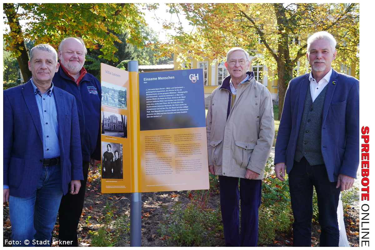 | Von 1885 bis 1889 lebte der Gerhart-Hauptmann mit seiner Frau Marie in Erkner. Wohnort war die Villa Lassen, in der die junge Familie die untere Etage bewohnte. In dem Haus kamen auch seine drei Söhne (Ivo, Klaus, Eckart) aus erster Ehe zur Welt.Dies waren vor allem beruflich prägende Jahre für den jungen Schriftsteller. Erkner inspirierte den späteren Literaturnobelpreisträger von 1912. Die Novelle „Fasching“, „Der Biberpelz“ oder „Bahnwärter Thiel“ spielen in Erkner, gehen inhaltlich auf Erkneraner Begebenheiten zurück bzw. Personen / Charaktere aus dem Ort fanden sich in Hauptmanns Werken wieder. In Erkner gibt es heute noch Orte, an denen der Schriftsteller gern verweilte oder es lebten dort nachweislich Personen, denen er ein literarisches Denkmal setzte, wie der Mutter Wolffen aus dem „Biberpelz“. Dies sind Gerhart-Hauptmann-Orte in Erkner.
