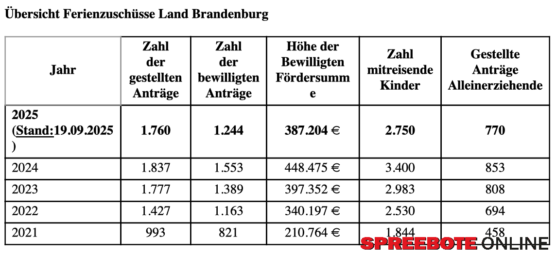 Die Nachfrage nach Ferienzuschüssen für Familien ist in Brandenburg in diesem Jahr außergewöhnlich hoch. Bis Mitte September gingen bereits 1.760 Anträge ein, davon 770 von Alleinerziehenden. Insgesamt konnten bislang 1.244 Anträge mit einem Gesamtvolumen von rund 387.000 Euro bewilligt werden. Damit möglichst viele Familien die beantragte Unterstützung erhalten, hat Familienministerin Britta Müller die dafür vorgesehenen Mittel für dieses Jahr um 60.000 Euro aufgestockt von ursprünglich 400.000 auf nun 460.000 Euro. Ministerin Britta Müller erklärt: Ich möchte, dass gerade Familien mit wenig Einkommen und insbesondere Alleinerziehende die Möglichkeit haben, mit ihren Kindern gemeinsame Ferien zu erleben. Sie sind am stärksten von Armut betroffen deshalb habe ich mich dafür entschieden, die Mittel für die Ferienzuschüsse aufzustocken. So können noch mehr Familien, die bereits einen Antrag gestellt haben, von dieser wichtigen Unterstützung profitieren.