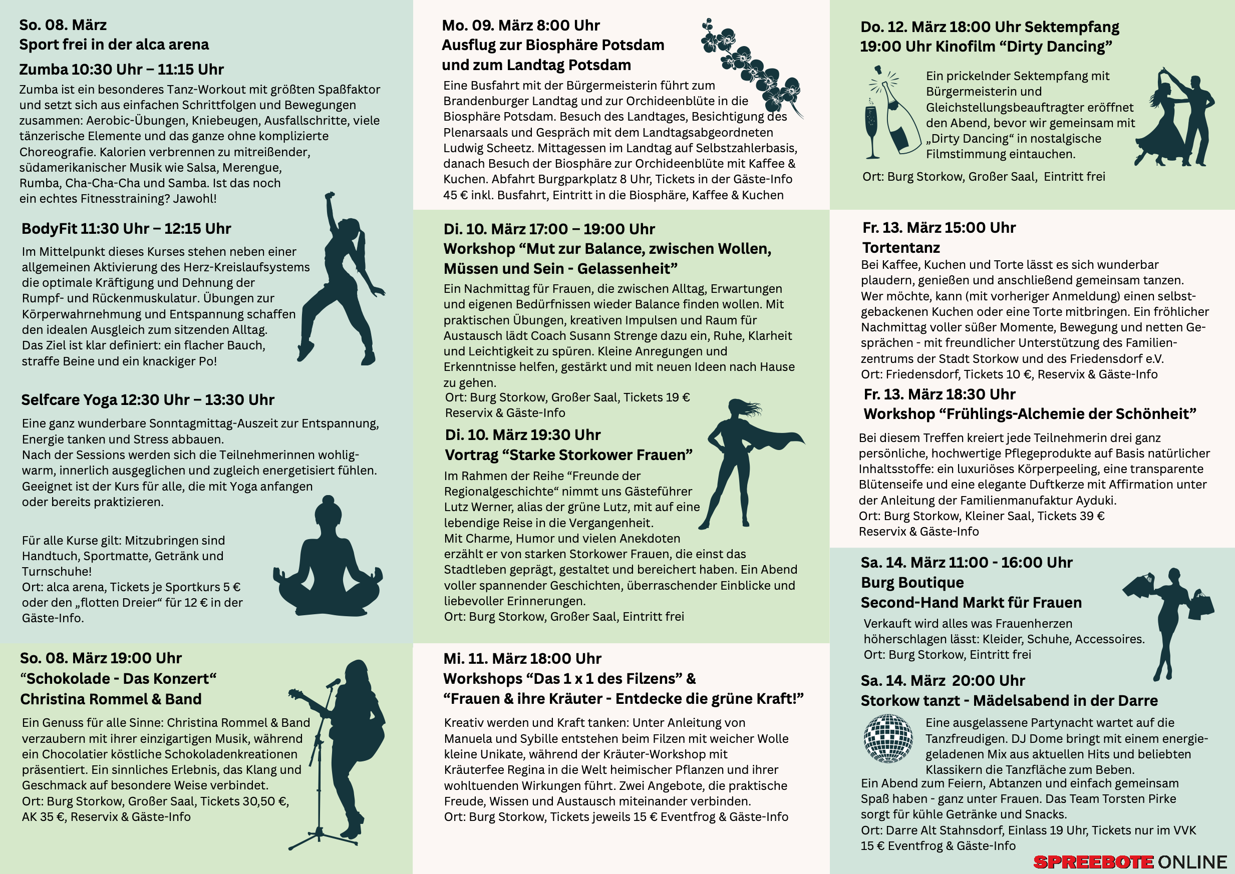 Mit der Storkower Frauenwoche setzen die Organisatorinnen ein starkes und zugleich herzliches Zeichen. Sie findet anlässlich der 36. Brandenburgischen Frauenwoche statt und greift deren landesweites Motto „Wut trifft Feminismus“ auf. Wut ist kein Makel, sondern eine Kraftquelle. Sie kann antreiben, Ungerechtigkeiten sichtbar zu machen und Veränderung mutig zu gestalten. In Storkow wird dieser Gedanke mit Leben gefüllt durch Bewegung, Kreativität, Inspiration und persönliche Begegnungen. Unters chiedliche Formate laden dazu ein, aktiv zu werden, gemeinsam zu gestalten und miteinander ins Gespräch zu kommen. So entstehen Räume, in denen neue Energie wachsen, Perspektiven sich öffnen und Selbstvertrauen gestärkt werden kann. Im Mittelpunkt steht das Miteinander. Denn Feminismus bedeutet hier vor allem, sich gegenseitig zu unterstützen, Erfahrungen zu teilen und gemeinsam Orte zu schaffen, in denen Vielfalt und Gleichstellung selbstverständlich sind. Ein besonderer Dank gilt dem Burgteam der Stadt Storkow sowie der Gleichstellungsbeauftragten, die diese Woche mit großem Engagement vorbereitet haben. Möge sie viele inspirierende Begegnungen schenken, neue Impulse setzen und vor allem Mut machen, so die Bürgermeisterin der Stadt Storkow Cornelia Schulze-Ludwig.