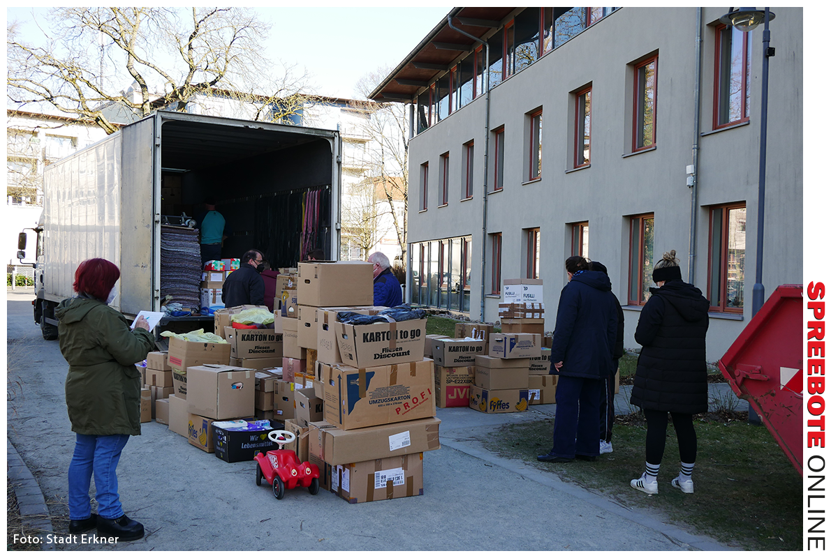 Am Sonnabend haben 25 freiwillige Helfer den ersten Transport mit Spenden für die Ukraine beladen. Insgesamt vier Tonnen Hilfsgüter sind bis dato zusammengekommen. Die Stadtverwaltung Erkner möchte sich recht herzlich bei allen Spendern aus Erkner, Hartmannsdorf, Gosen-Neu Zittau, Grünheide, Woltersdorf, Berlin-Lichtenberg und Berlin-Schöneweide bedanken. Ein besonderer Dank geht an beide Kirchengemeinden, den Seniorenbeirat, den Unterstützerkreis, die Schulen und Kitas, die die Spendensammlung mitgetragen haben und ganz fleißige Helfer zum Sortieren und Verpacken organisierten. Ein vollbeladener LKW und zwei Fahrzeuge der Stadtverwaltung fuhren am Sonnabend zum Sitz des Vereins cura hominum e.V. nach Lobetal. Dieser Verein befindet sich unter dem Dach der Hoffnungstaler Stiftung Lobetal. Jede gepackte Umzugskiste aus Erkner mit Lebensmitteln, Hygieneartikeln, Wolldecken oder Bettwäsche wurde gewogen, sogleich in Verladelisten vermerkt und wurde dann auf einen ukrainischen LKW verladen.