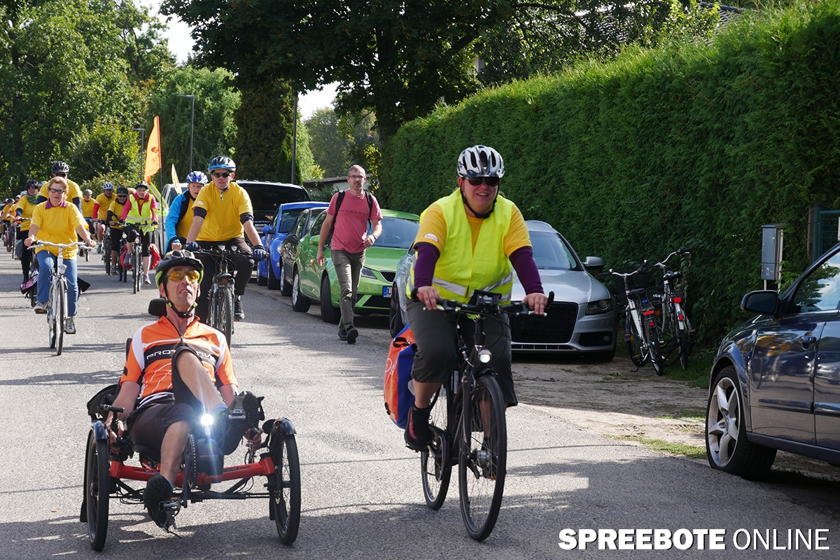 Die Teilnehmer der 18. Tour de Tolérance wurden am Sonnabendvormittag im Sportzentrum Erkner durch Bürgermeister Henryk Pilz mit einer kurzen Rede herzlichst begrüßt. Der Artikel 1 des Grundgesetzes untermauerte das Grundverständnis der Tour „Die Würde des Menschen ist unantastbar“. 100 Fahrradfahrer machten sich von Altlandsberg über Neuenhagen zum Zwischenstopp nach Erkner auf den Weg, um dann in Rüdersdorf auf dem Marktplatz eine Mittagspause einzulegen. Von da ging es mit einem Durchschnittstempo von ca. 15 Stundenkilometern weiter nach Petershagen/Eggersdorf, anschließend zum Alten Gutshof nach Fredersdorf-Süd und dann zurück nach Altlandsberg.
