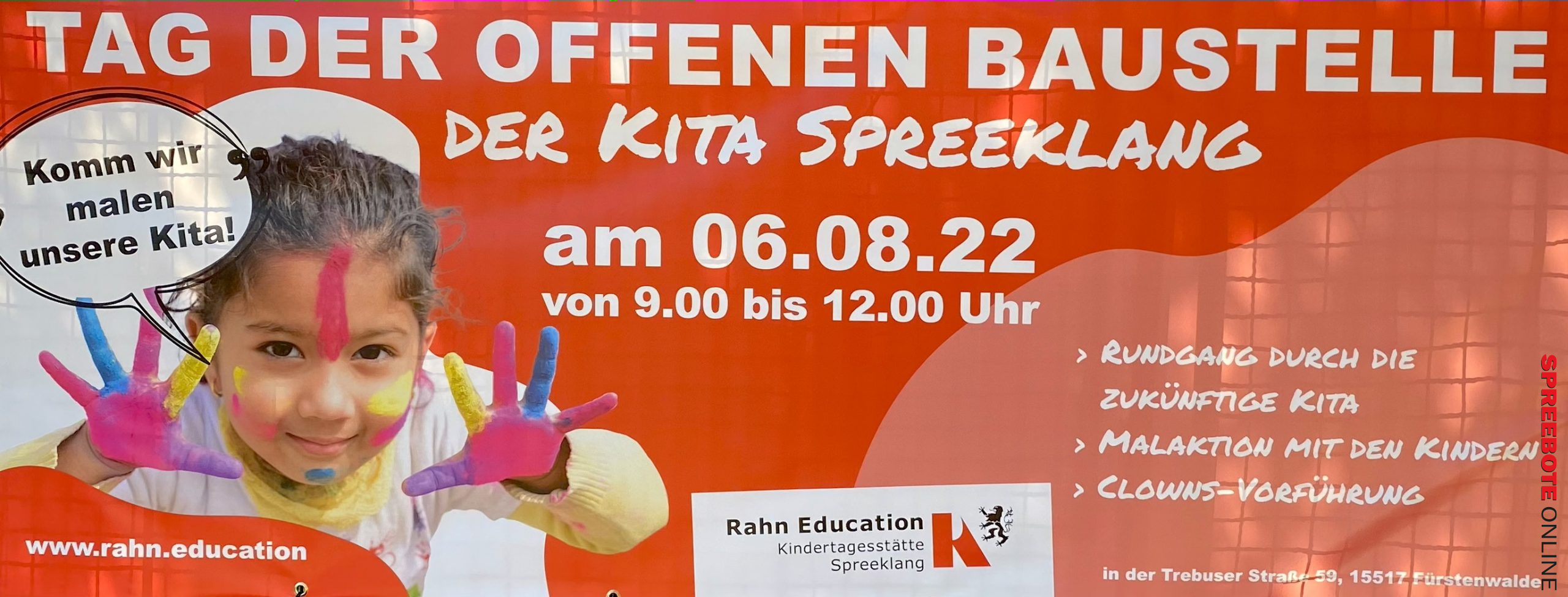 Schon jetzt die neue Kita Spreeklang bewundern? Dazu haben Interessierte am Samstag, 6. August, von 9 bis 12 Uhr Gelegenheit! Die Kita Spreeklang der Rahn Education lädt zum Tag der offenen Baustelle – die Besucher erwartet ein Rundgang durch die zukünftige Kindertagesstätte, interaktive und spielerische Malaktionen auf der Baustelle sowie Snacks und jede Menge Infos zur neuen Kita in der Trebuser Straße 59. Die neue Kita Spreeklang zeichnet sich aus durch das musisch-künstlerische Trägerkonzept, Englisch und durch Gesang-, Tanz- und Rhythmik-Angebote. Die Kinder erleben den Kita-Alltag in festen Bezugsgruppen in einer teiloffenen Arbeit. Funktionsräume fördern und fordern die Individualität jedes einzelnen Kindes und ermöglichen es, gemeinsamen Interessen nachzugehen. Die Krippenkinder werden im Erdgeschoss ruhige Rückzugsorte zum Kuscheln und Erkunden finden. Die Eingewöhnungen laufen im engen Austausch mit den Eltern in einer entspannten Atmosphäre ab. Die Kita Spreeklang wird in einem Neubau mit hellem und offenem Ambiente in der Trebuser Straße 59 in Fürstenwalde einziehen. Ein großer Bewegungsraum, eine Kletterlandschaft sowie ein Atelier bieten neben weiteren Funktionsräumen genug Platz und viele Möglichkeiten zum Forschen, zum Experimentieren und sich wohlfühlen. In der Kindertageseinrichtung wird inspiriert von der Reggio-Pädagogik gearbeitet. Im Außenbereich wird unter anderem eine Wasserspiellandschaft entstehen. Durch die enge Verzahnung mit dem Campus am Spreebogen und der Freien Grundschule Fürstenwalde, sowie der Musik- und Kunstschule Clara Schumann in Fürstenwalde – beide ansässig in der Eisenbahnstraße 18/19, gibt es für die Kinder die individuelle Option, deren Angebote zu nutzen.