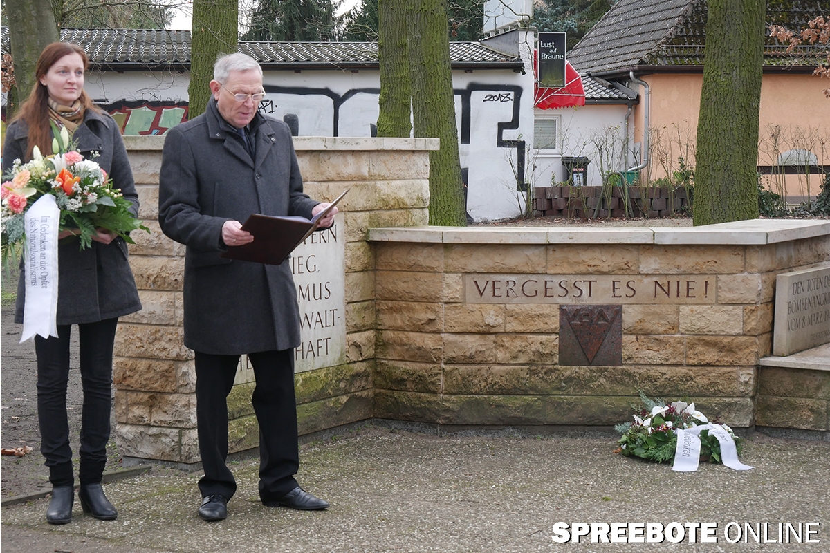 Aus Anlass dieses Tages fand an der Erinnerungsstätte am Hohenbinder Weg am Montagnachmittag ein öffentliches Gedenken mit einer Kranzniederlegung statt. Lothar Eysser, der Vorsitzende der Stadtverordnetenversammlung Erkner, erinnerte in seiner Rede nicht nur an die jüdischen Opfer, sondern auch an die Sinti, Roma, Ausgegrenzten, Verfolgten, Schikanierten, Inhaftierten, die im Widerstand getöteten Menschen und vielen anderen, die in der Zeit der Naziherrschaft Opfer von Gewalt wurden und oft auf grausamste Weise ums Leben kamen.