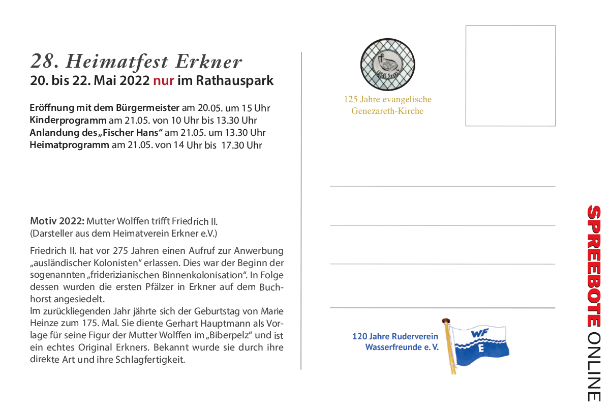 Die Postkarte wird sonst zeitig im Jahr erstellt, um bereits auf Tourismusveranstaltungen für Erkner und sein Heimatfest zu werben. Dies ist 2022 anders, denn Erkner bewirbt sein Stadtfest nicht in Berlin oder der Region. Aber, viel wichtiger ist: Wer auf der Postkarte drauf ist. Es sind zwei Personen, die sich im wahren Leben nie begegnet sind: Mutter Wolffen und Friederich der Große. Beide Figuren sind mit der Geschichte Erkners verbunden. Friedrich, der II. hat vor über 275 Jahren einen Aufruf zur Anwerbung „ausländischer Kolonisten“ erlassen. Dies war der Beginn der „friderizianischen Binnenkolonisierung“. Erst dadurch war es Familien aus der Pfalz möglich sich in Erkner anzusiedeln. Mutter Wolffen ist eine Figur aus Gerhart Hauptmanns sozialkritischem Drama „Der Biberpelz“. Vorbild für diese Figur war Marie Heinze. Ihr Geburtstag jährte sich im vergangenen Jahr zum 175. Mal. Mutter Wolffen ist ein echtes Original. Das Herz auf dem rechten Fleck, direkt in ihrer Art, gepaart mit einer großen Portion Schlagfertigkeit. Friedrich, der II. und Mutter Wolffen hätten sich bestimmt viel zu sagen gehabt: Naja, wenn der Preußenkönig überhaupt zu Wort gekommen wäre, oder? Am Heimatfest- Sonnabend, den 21. Mai 2022, um 13.15 Uhr werden diese zwei historischen Figuren zusammentreffen: Auf der Bühne im Rathauspark. Das ist im Rahmen des Kinderprogramms geplant, also kindgerecht. Bereits zur Eröffnung am Freitag ist erstes Zusammentreffen geplant. Wer die Postkarte in den Händen hält, wird den Termin gewiss nicht vergessen. Sie ist zu bekommen u.a. in der Stadtbibliothek, im Bürgerbüro der Stadtverwaltung, im Gerhart-Hauptmann-Museum, im Heimatmuseum, im Büro der Wohnungsgesellschaft und bei aktiv teilnehmenden Vereinen.
