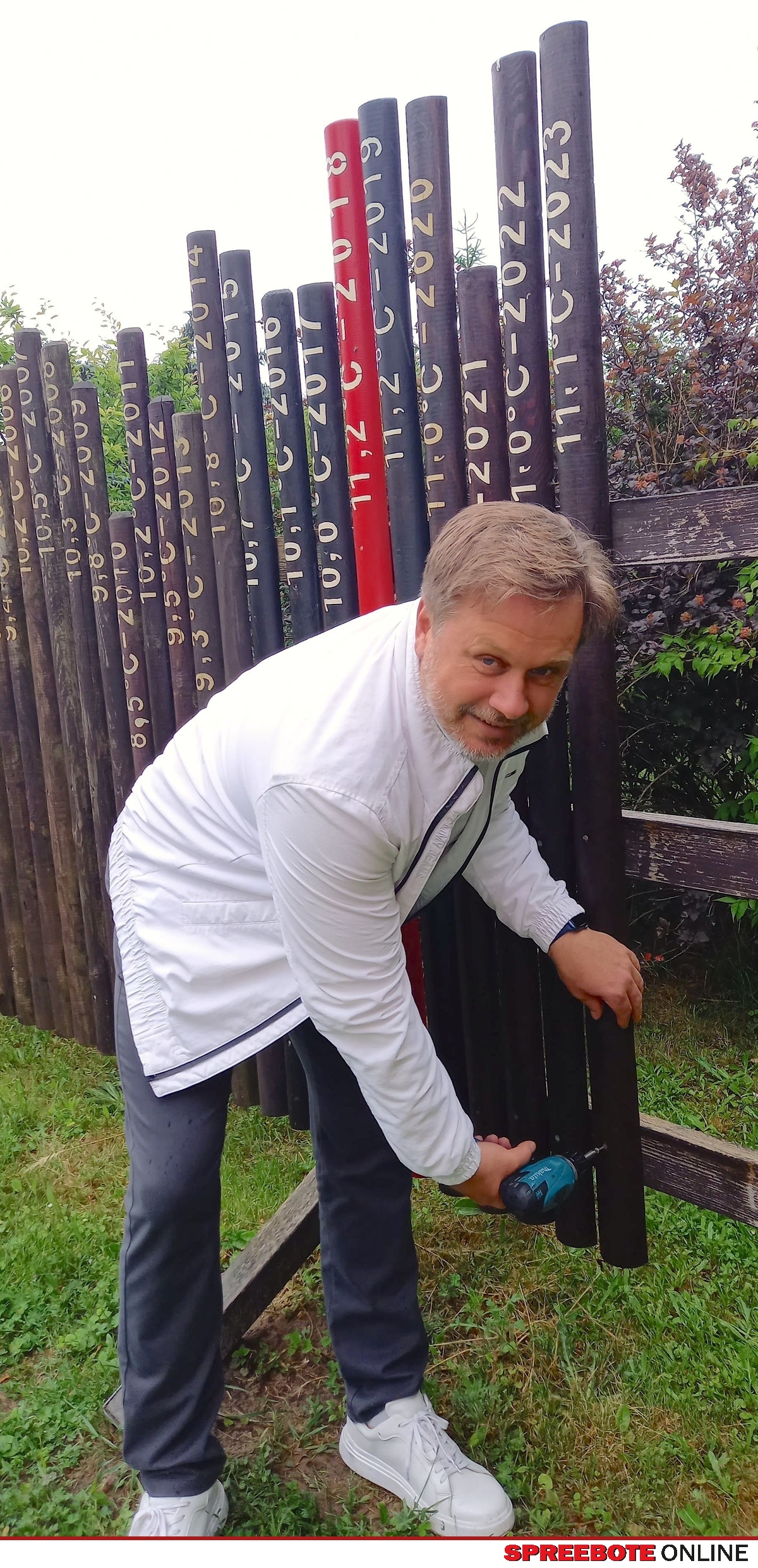 Einer nun langjährigen Tradition folgend helfen Politiker oder besondere Gäste – einmal war es auch ein Hochzeitspaar – beim Anschrauben der Holzlatte, deren Länge für die Jahresmitteltemperatur des Vorjahres steht. Am Montag war es der Landrat des Landkreises Oder-Spree Frank Steffen, im kommenden Sommer ein Jahr im Amt, der die Einladung gern annahm und mit dem Akkuschrauber keine Mühe hatte.