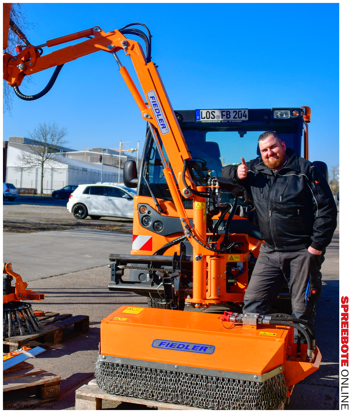 Dem Multicar kann man schwer was vormachen – im wahrsten Sinne des Wortes. Stephan Bartsch, der nicht nur ein technikaffiner Mensch ist, sondern auch ein begeisterter Enthusiast auf dem Gebiet der Technik, im Speziellen der Kommunaltechnik, ist, hat sein Multitasking-Gerät Multicar M31 vorgestellt. Die Firma Bartsch aus Fürstenwalde, die sich seit Jahrzenten auf diesem Gebiet spezialisiert hat, weiß, wovon hier gesprochen wird. Der Multicar ist ein Alleskönner und das Nonplusultra, die Anbauerweiterungsgerätschaften, ist so vielseitig, dass damit viel erledigt werden kann – nicht nur die Straßenreinigung, sondern auch das Pflegen von Grünanlagen, zum Beispiel Bewässerung von Bäumen, sind ja in der heutigen Zeit sehr gefragt. Das Rasenmähen wird durch einen „Schlegelmulcher“ übernommen, der in seinem Inneren eine Walze und daran befindliche Messer hat. Diese Walze bewegt sich entgegen der Fahrtrichtung, so Stephan Bartsch, und mäht das Gras. Durch ein Gegenmesser wird das Schnittgut gemulcht. Der Mulch wird dann gleichmäßig auf die Fahrbahn verteilt. Die Dimensionen sind riesig, zum Beispiel beim Ausleger, den man bis zu 3 Meter in die Höhe fahren kann. Auch Geräte wie eine Heckenschere, die mit einer Schnittbreite von 1,50 Metern arbeitet, oder eine Astschere in nahezu gleicher Abmessung, die für das Lichtraumprofil an Bäumen als Straßenbegleitgrün montiert werden kann, sind optionale Zubehörteile für das Fahrzeug. Der Vorteil für die Mitarbeiter ist, so Bartsch, das zum Beispiel der fließende Verkehr nicht durch herumfliegende Splitter, Späne oder Holzstücke gefährdet ist. In Verbindung mit dem Ausleger ist ein exakter Schnitt, hohe Flexibilität und präzises Arbeiten garantiert. Im Weiteren gibt es noch einen kreisrunden Stahlbesen für die Bankettenpflege, der nicht nur dort eingesetzt werden kann, sondern auch für die umweltfreundliche Beseitigung von Wildkraut geeignet ist. Die mögliche Seitenverstellung der Bürste ermöglicht mühelose Arbeitserledigungen in Kantenbereiche sowie an Straßenrändern. So ist sie bestens geeignet zur Reinigung von Rad- und Fußwegen, Plätzen, Schulhöfen, Terrassen und vielem mehr, außerdem ist sie anwendbar für unterschiedliche Pflasterarten. Für diesen Einsatzzweck ist sie mit kunststoffummantelten Drahtseilzöpfen ausgestattet, die eine hohe Belastbarkeit und optimale Reinigungsergebnisse gewährleisten.