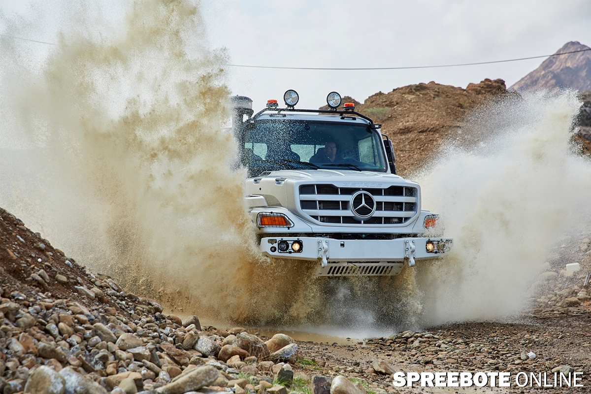 Weltpremiere der neuen Generation des Mercedes-Benz Zetros. Der robuste Geländespezialist ist geschaffen für den Transport von Gütern in schwerem und unzugänglichem Terrain. Konzipiert ist der hochgeländegängige 40-Tonnen-Lkw für den harten Einsatz in Märkten mit hohem Off-Road-Anteil. Der neue Zetros präsentiert sich jetzt komplett runderneuert: Technisch verfügt die neue Zetros Generation über stärkere Motoren bis maximal 375 kW (510 PS) und über ein sattes Drehmoment von 2400 Nm. Äußerlich erkennt man den neuen Zetros am neu gestalteten markanten Kühlergrill, der durch optimierte Luftführung eine noch effektivere Kühlung ermöglicht. Der neue Zetros zeichnet sich mit seinem permanenten Allradantrieb durch eine extreme Geländegängigkeit aus. Er verfügt über zahlreiche Detailverbesserungen, wie beispielsweise einen leichteren Einstieg oder eine neu gestaltete Armaturentafel. Auch der neue Zetros ist in Euro III und Euro V für Märkte mit unzureichender Kraftstoffqualität lieferbar und findet seine Hauptabsatzmärkte daher in Regionen wie Nahost, Afrika oder Lateinamerika. Der Mercedes-Benz Zetros ist ein Schwerlast-Lkw, der für die anspruchsvollsten Transportaufgaben mit hoher Nutzlast ausgelegt ist. Daher findet er Anwendung in der Energieexploration, Versorgung von abgelegenen Gebieten und im Forschungseinsatz. Der neue Zetros kann weltweit in allen extremen Klimaregionen im Einsatz sein – von heißen Wüstenregionen bis zur Arktis.