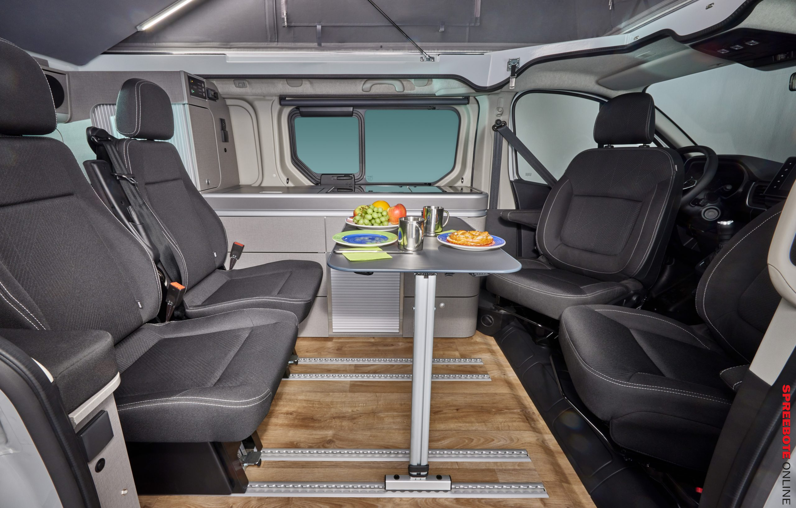 Bis zu vier Einzelsitze (Standardausstattung zwei) mit Längs- und Lehnen-Verstellung lassen sich ganz ohne Werkzeug individuell positionieren oder herausnehmen (zusätzlich in und gegen die Fahrtrichtung nutzbar). So entsteht je nach Bedarf auch genügend Stauraum, um beispielsweise Fahrräder, Kinderwagen, Surfbretter oder Skier zu transportieren. Die Sitze der ersten Reihe sind drehbar, sodass zum gemeinsamen Essen am verstellbaren Tisch eine Viererkonfiguration entsteht. Der Esstisch ist mit Klappfüßen ausgerüstet und kann zusätzlich mit klappbaren Halterungen in der Küchenkonsole eingehängt werden. So ist er flexibel auch im Außenbereich des Campers nutzbar.