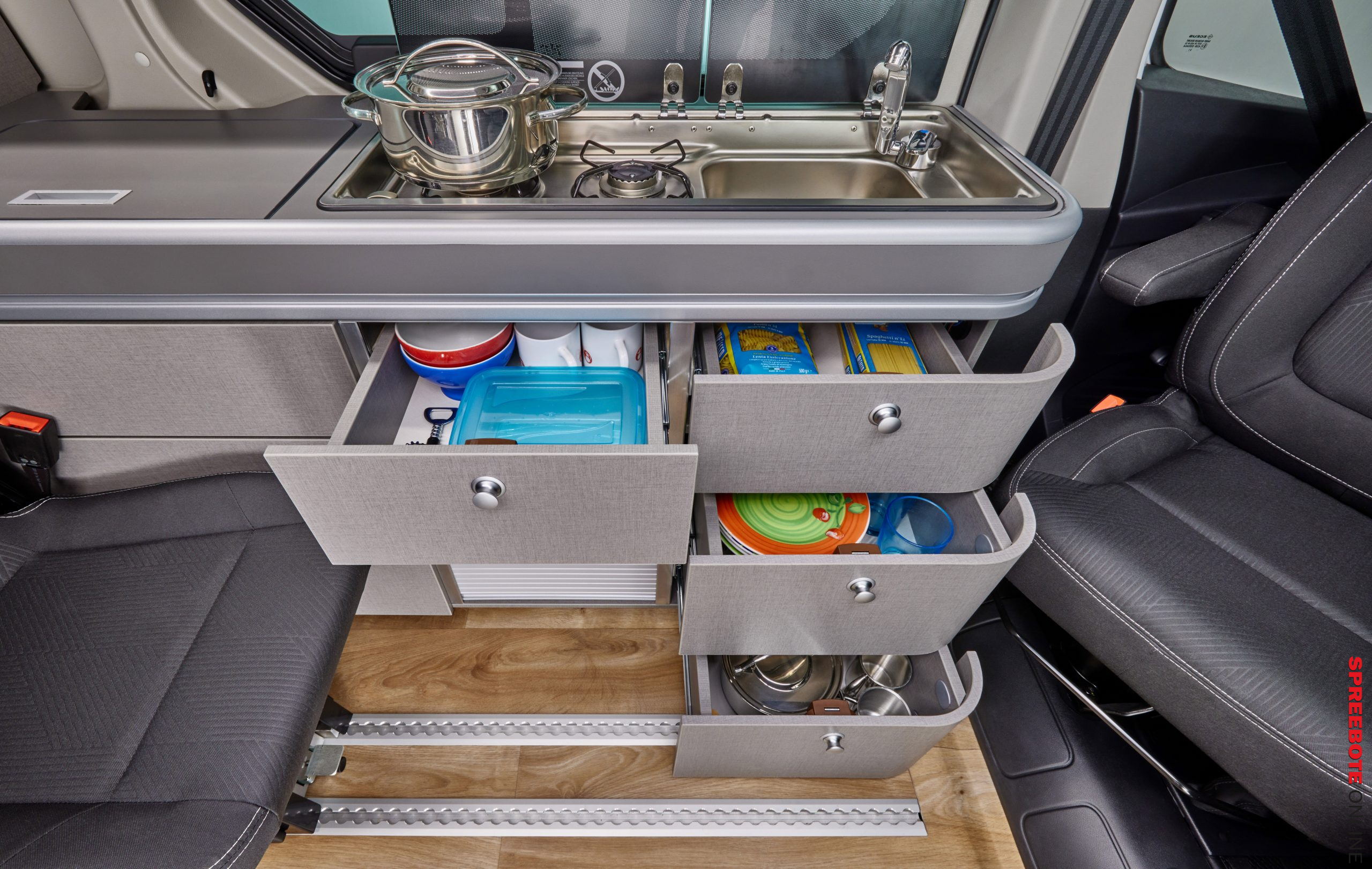 Verderbliche Lebensmittel und Getränke finden in einem Kühlschrank mit 36 Liter Volumen Platz, eine warme Mahlzeit lässt sich auf dem zweiflammigen Gaskocher zubereiten. Zusätzlichen Stauraum für Kochutensilien und Campinggeschirr bieten vier Schubladen sowie ein großes Rollo-Fach. Bei Nichtbenutzung werden der Kocher und die Edelstahlspüle von einer Echtglasplatte abgedeckt. Sowohl die Oberflächen als auch der Fahrzeugboden sind besonders leicht zu reinigen. Im Kleiderschrank mit Rollo-System, in dem auch das Fach für die Gasflasche integriert ist, können Reisehungrige ihre Ausrüstung unterbringen. Platzsparend unter dem Kleiderschrank ist außerdem der Frischwassertank mit einem Volumen von insgesamt 29 Litern verbaut. Für gemütliches Ambiente sorgen dimmbare LED-Lichtbänder im oberen Lattenrost sowie im Dachstaukasten. Durch LED-Schwanenhals-Strahler mit integrierter USB-Steckdose im Aufstelldach finden sich Reisende auch im Dunkeln gut zurecht.