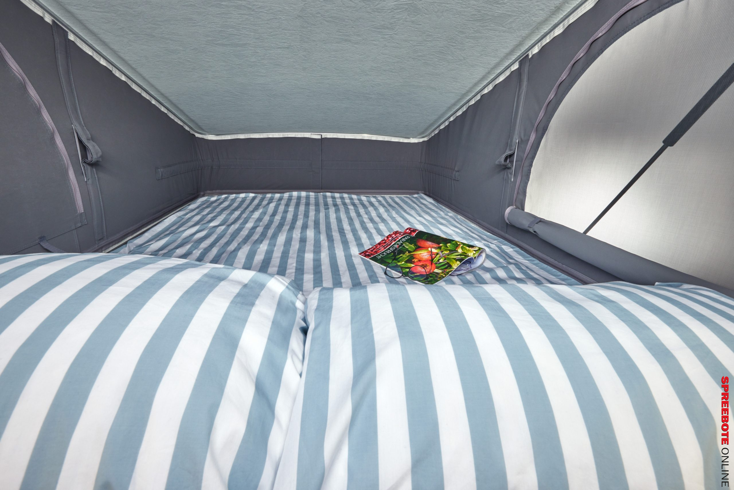 Das faltbare untere Bett mit Kaltschaummatratze hat eine Liegefläche von ca. 2,00 x 1,25 Meter und kann bei Bedarf ganz ohne Werkzeug aus dem Auto entnommen werden. Auch das Dachbett mit Lattenrost verfügt über eine vollflächige Unterfederung, ist bis 240 Kilogramm belastbar und hat eine Liegefläche von ca. 1,89 x 1,25 Meter. Das Schienensystem im Fahrgastraum, das über die gesamte Ladefläche im Boden eingelassen ist, erlaubt eine modulare Bestuhlung und damit maximale Flexibilität für alle Beladungssituationen.
