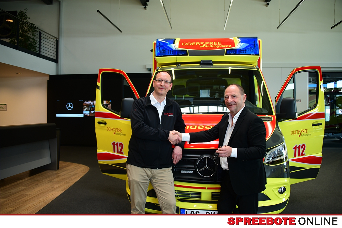 Feierliche Übergabe von den ersten vollausgestatteten Rettungsfahrzeugen durch die FGM Mercedes Benz in Fürstenwalde. Im würdigen Rahmen des neugestalteten Hauses, im Speziellen in der Transporter-Ausstellung, wurden die drei Fahrzeuge medial in Szene gesetzt. Frank Mettchen sprach über die jahrzehntelange Partnerschaft zwischen Mercedes und dem Rettungsdienst im Landkreis Oder-Spree. Die Zusammenarbeit sei immer, so auch der Geschäftsführer des Rettungsdienstes, Michael Rochow, auf Augenhöhe. Man würde sich gut verstehen und wenn es mal schwierig würde, könne man sich aufeinander verlassen. Das sei eine besondere Tugend und hätte das Vertrauensverhältnis besonders gefestigt. So ein Rettungsfahrzeug fährt in seinem Rettungsleben mehrere Hundertausende Kilometer und ist 7 Tage die Woche an 24 Stunden täglich, also an 365 Tagen im Einsatz. Das zerrt natürlich an der Technik, am Fahrverhalten. Auch die Zeit der Neuentwicklungen schreitet immer weiter voran, so dass die Fahrzeuge, soweit möglich, im großen Stil gewechselt werden müssen, um ihrer fachlichen Kompetenz Sorge zu tragen. Drei neue Rettungsfahrzeuge der Marke Mercedes sind der Anfang, 13 weitere werden noch bis 2025 folgen. Dabei ist das preisliche Volumen eines Fahrzeuges recht erheblich, zwischen 350.000 und 380.000 Euro kann das schon kosten, wobei das Fahrgestell nur 1/3 des Preises ausmacht. 2/3 sind die Umbauten, der große Koffer, die besondere Ausstattung mit medizinischen Geräten der neuesten Generation, dazu kommen Neuerungen im Innenausbau und der funktionalen Trage und weiteren verschiedenen Hilfen. Die Rettungsfahrzeuge werden auf den gesamten Landkreis Oder-Spree verteilt und gewechselt. Einige bleiben am zentralen Ort für den Fall, dass mehr Einsatzfahrzeuge gebraucht werden, wenn es zu einem Ernstfall kommen sollte.