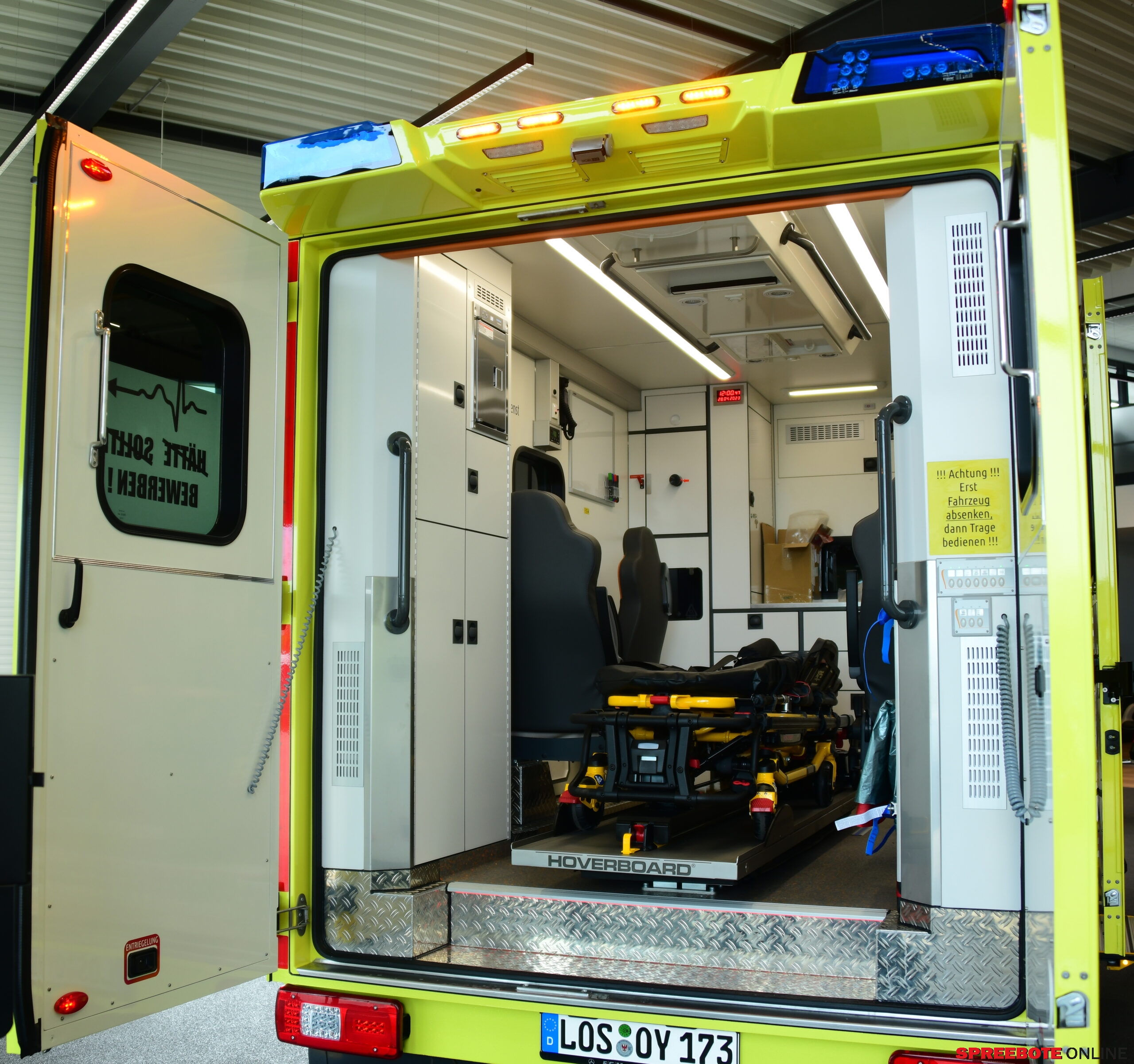 Feierliche Übergabe von den ersten vollausgestatteten Rettungsfahrzeugen durch die FGM Mercedes Benz in Fürstenwalde. Im würdigen Rahmen des neugestalteten Hauses, im Speziellen in der Transporter-Ausstellung, wurden die drei Fahrzeuge medial in Szene gesetzt. Frank Mettchen sprach über die jahrzehntelange Partnerschaft zwischen Mercedes und dem Rettungsdienst im Landkreis Oder-Spree. Die Zusammenarbeit sei immer, so auch der Geschäftsführer des Rettungsdienstes, Michael Rochow, auf Augenhöhe. Man würde sich gut verstehen und wenn es mal schwierig würde, könne man sich aufeinander verlassen. Das sei eine besondere Tugend und hätte das Vertrauensverhältnis besonders gefestigt. So ein Rettungsfahrzeug fährt in seinem Rettungsleben mehrere Hundertausende Kilometer und ist 7 Tage die Woche an 24 Stunden täglich, also an 365 Tagen im Einsatz. Das zerrt natürlich an der Technik, am Fahrverhalten. Auch die Zeit der Neuentwicklungen schreitet immer weiter voran, so dass die Fahrzeuge, soweit möglich, im großen Stil gewechselt werden müssen, um ihrer fachlichen Kompetenz Sorge zu tragen. Drei neue Rettungsfahrzeuge der Marke Mercedes sind der Anfang, 13 weitere werden noch bis 2025 folgen. Dabei ist das preisliche Volumen eines Fahrzeuges recht erheblich, zwischen 350.000 und 380.000 Euro kann das schon kosten, wobei das Fahrgestell nur 1/3 des Preises ausmacht. 2/3 sind die Umbauten, der große Koffer, die besondere Ausstattung mit medizinischen Geräten der neuesten Generation, dazu kommen Neuerungen im Innenausbau und der funktionalen Trage und weiteren verschiedenen Hilfen. Die Rettungsfahrzeuge werden auf den gesamten Landkreis Oder-Spree verteilt und gewechselt. Einige bleiben am zentralen Ort für den Fall, dass mehr Einsatzfahrzeuge gebraucht werden, wenn es zu einem Ernstfall kommen sollte.