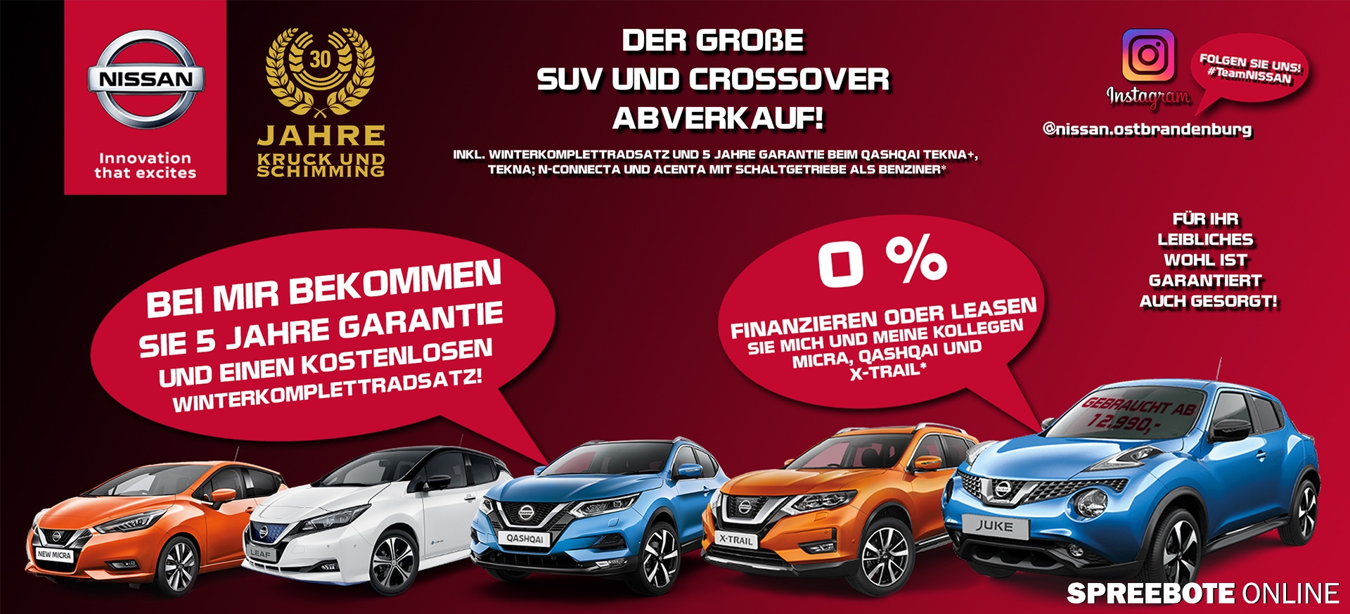 Am 21. September ist in den Filialen der Nissan Niederlassungen in Fürstenwalde, Frankfurt (Oder) und Eisenhüttenstadt in der Zeit von 9 bis 15 Uhr der „Tag der offenen Tür“ & das 30 Jahre Jubiläum Kruck & Schimming.