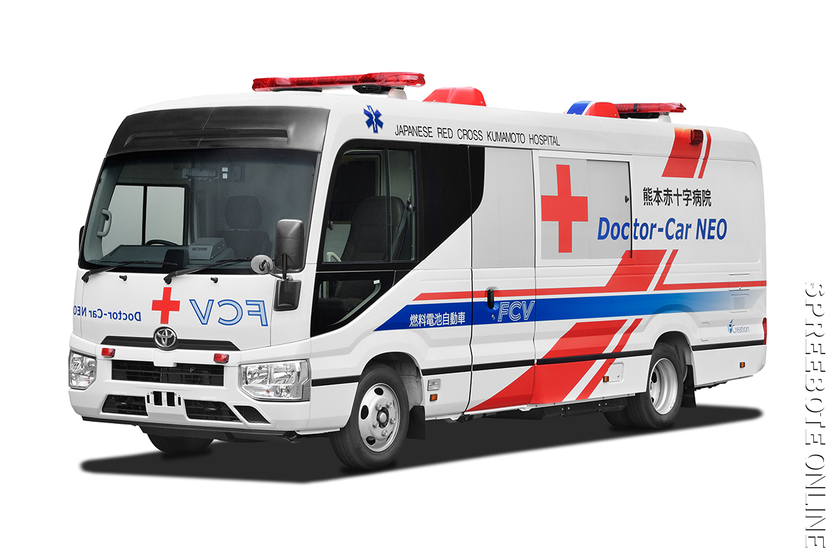 | Ein Krankenhaus des Japanischen Roten Kreuzes und die Toyota Motor Corporation starten mit dem Test des weltweit ersten Rettungsfahrzeugs mit Brennstoffzellen-Elektroantrieb und Wasserstoff-Stromerzeugung. Das Projekt beginnt im Sommer dieses Jahres und soll bestätigen, dass kommerzielle Brennstoffzellenfahrzeuge im Medizinbereich und Katastrophenschutz einsatzfähig sind und zur Senkung der CO2-Emissionen beitragen können. Wirbelstürme, Starkregen und andere Naturkatastrophen sind in den vergangenen Jahren immer häufiger geworden, was nicht nur die Stromversorgung von Wohnhäusern und Evakuierungszentren bedroht, sondern auch den Bedarf an medizinischer Versorgung in den betroffenen Gebieten steigert. Vor diesem Hintergrund arbeitet Toyota seit dem letzten Jahr mit dem Kumamoto Krankenhaus des Japanischen Roten Kreuzes an Lösungen. Das Ergebnis dieser Partnerschaft ist ein Krankenfahrzeug auf Basis des Toyota Minibusses Coaster, der das Brennstoffzellensystem der Limousine Mirai Wasserstoff kombiniert 0,89-0,79 kg/100 km; Stromverbrauch kombiniert 0 kWh/100 km; CO2-Emissionen kombiniert 0 g/km nutzt.