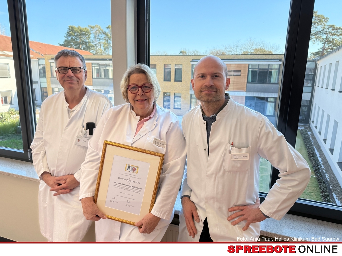 Dr. med. Hannelore Heidemann wird als erste Frau zum Ehrenmitglied der Berlin-Brandenburgischen Chirurgischen Gesellschaft ernannt. Frau Dr. med. Hannelore Heidemann, eine hochgeschätzte und erfahrene Spezialistin für Schilddrüsenchirurgie im Helios Klinikum Bad Saarow, wurde auf der Jahrestagung der Berlin-Brandenburgischen Chirurgischen Gesellschaft zum Ehrenmitglied ernannt. Diese Auszeichnung stellt die höchste Anerkennung der Regionalgesellschaft für Chirurgen aus Berlin und Brandenburg dar.
