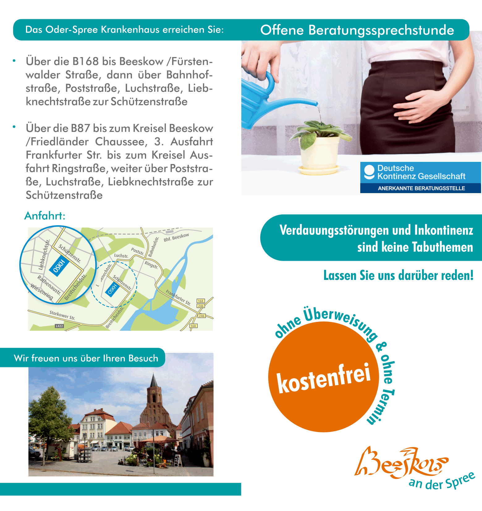 Sie können ohne Überweisung und einen festen Termin unsere Inkontinenzsprechstunde oder unsere Ernährungsberatung kostenfrei aufsuchen. Vorhergehende Anfragen nehmen wir natürlich gerne entgegen unter 03366 – 444401 oder per