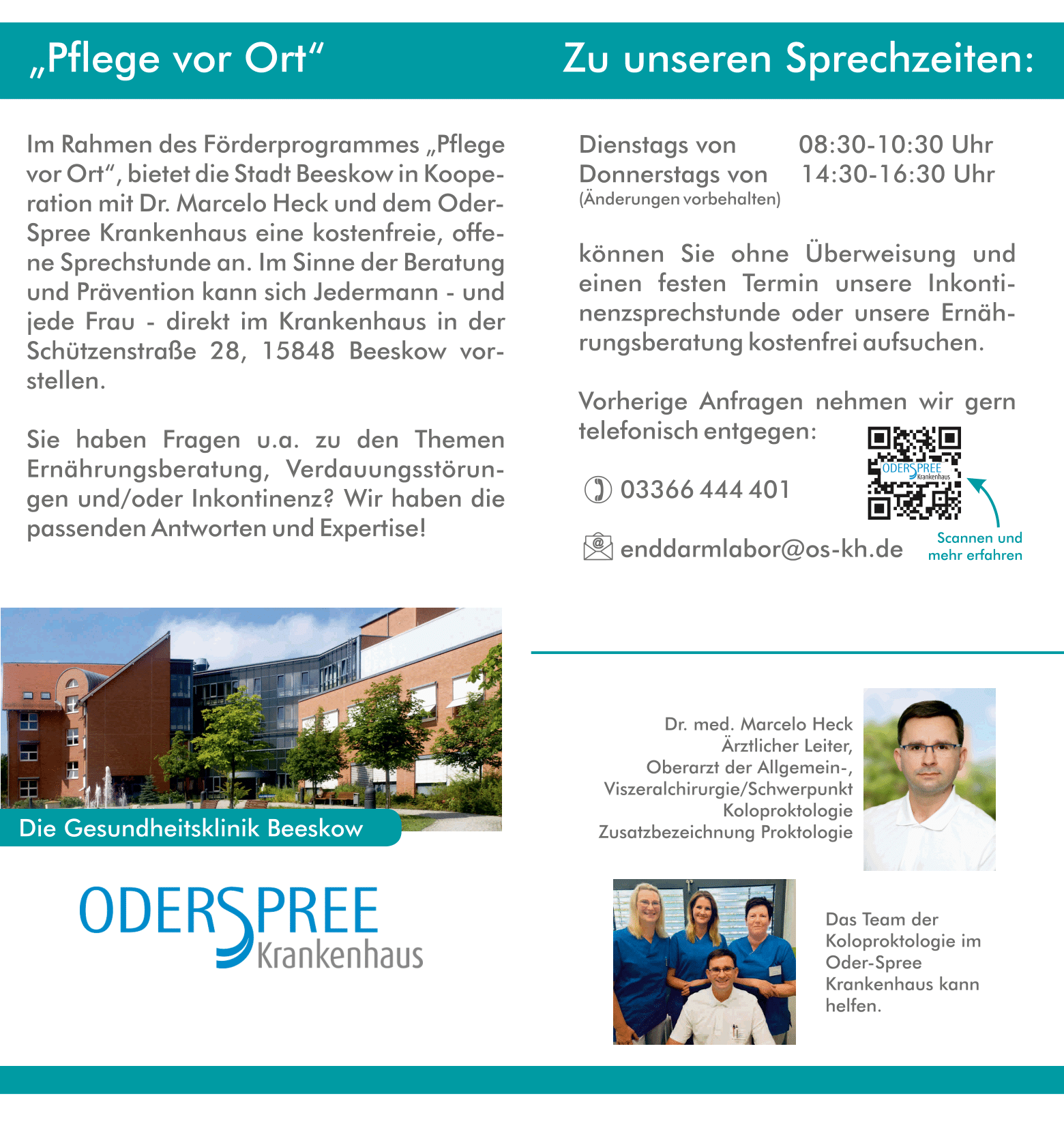 Chefarzt Dr. med. Marcelo Heck, Facharzt für Chirurgie und Oberarzt mit Schwerpunkt Koloproktologie und Viszeralchirurgie des Oder-Spree-Krankenhauses bietet im Rahmen des Förderprogramms „Pflege vor Ort“ mit der Stadt Beeskow in Kooperation und dem Oder-Spree-Krankenhaus eine kostenfreie offene Sprechstunde an.
