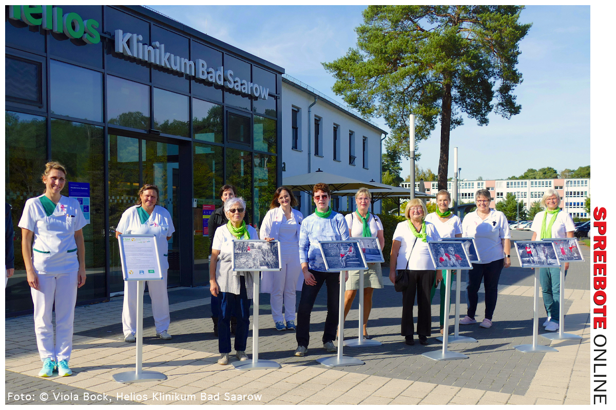 | Der Oktober ist der Brustkrebsmonat. Den Auftakt für die vier Wochen, die im Zeichen der Erkrankung stehen, bildet der weltweite Brustkrebstag am 1. Oktober. Auch das Helios Klinikum Bad Saarow setzt im Kampf gegen Brustkrebs ein Zeichen. Mut machende Bilder von der Frauenselbsthilfe-Gruppe Krebs e.V. aus Rüdersdorf sind jetzt für sechs Wochen im Eingangsfoyer des Klinikums zu sehen. Auch die Veranstaltungsreihe Mamma-Café findet in diesem Monat am 25. Oktober unter dem Motto: „Aromapflege – kleine Anleitung zur Selbsthilfe“ statt. Brustkrebs ist die häufigste Form der Krebserkrankung bei Frauen. Eine von acht erkrankt im Laufe ihres Lebens an einem bösartigen Brusttumor. Die Diagnose trifft Betroffene meist unvorbereitet, für viele ist sie zunächst ein Schock, sie löst große Ängste und Sorgen aus. Professionelle Hilfe und Begleitung bietet das zertifizierte Brustzentrum im Helios Klinikum Bad Saarow Betroffenen und ihren Angehörigen an.„Dank des Mammographie-Screenings und modernster Behandlungs- und Therapiemöglichkeiten haben sich die Heilungschancen für die Betroffenen, vor allem dann, wenn das Mammakarzinom frühzeitig erkannt wird, erheblich verbessert“, betont Dr. med. Maren Sawatzki, Chefärztin der Klinik für Senologie. Um mehr Aufmerksamkeit für die Erkrankung zu schaffen, ziert nicht nur die rosa Schleife, als weltweites unverkennbares Symbol im Kampf gegen Brustkrebs, nun vier Wochen lang die Kleidung der Mitarbeiter:innen des zertifizierten Brustzentrums im Helios Klinikum Bad Saarow. Auch eine Fotoausstellung von der Frauenselbsthilfe-Gruppe Rüdersdorf macht Betroffenen Mut und zeigt, dass auch schwere Momente gemeinsam überstanden werden können und es ein Licht am Ende des Tunnels gibt. Die Fotoserie ist nun für sechs Wochen im Eingangsfoyer des Klinikums ausgestellt.
