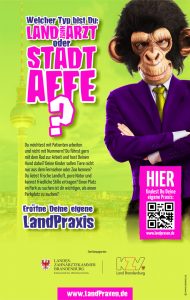 Mit dem provokanten Slogan „Landzahnarzt oder Stadtaffe?“ wollen die brandenburgischen Zahnärzte auf sich und das attraktive Landleben aufmerksam machen. Grund ist der fehlende Nachwuchs.