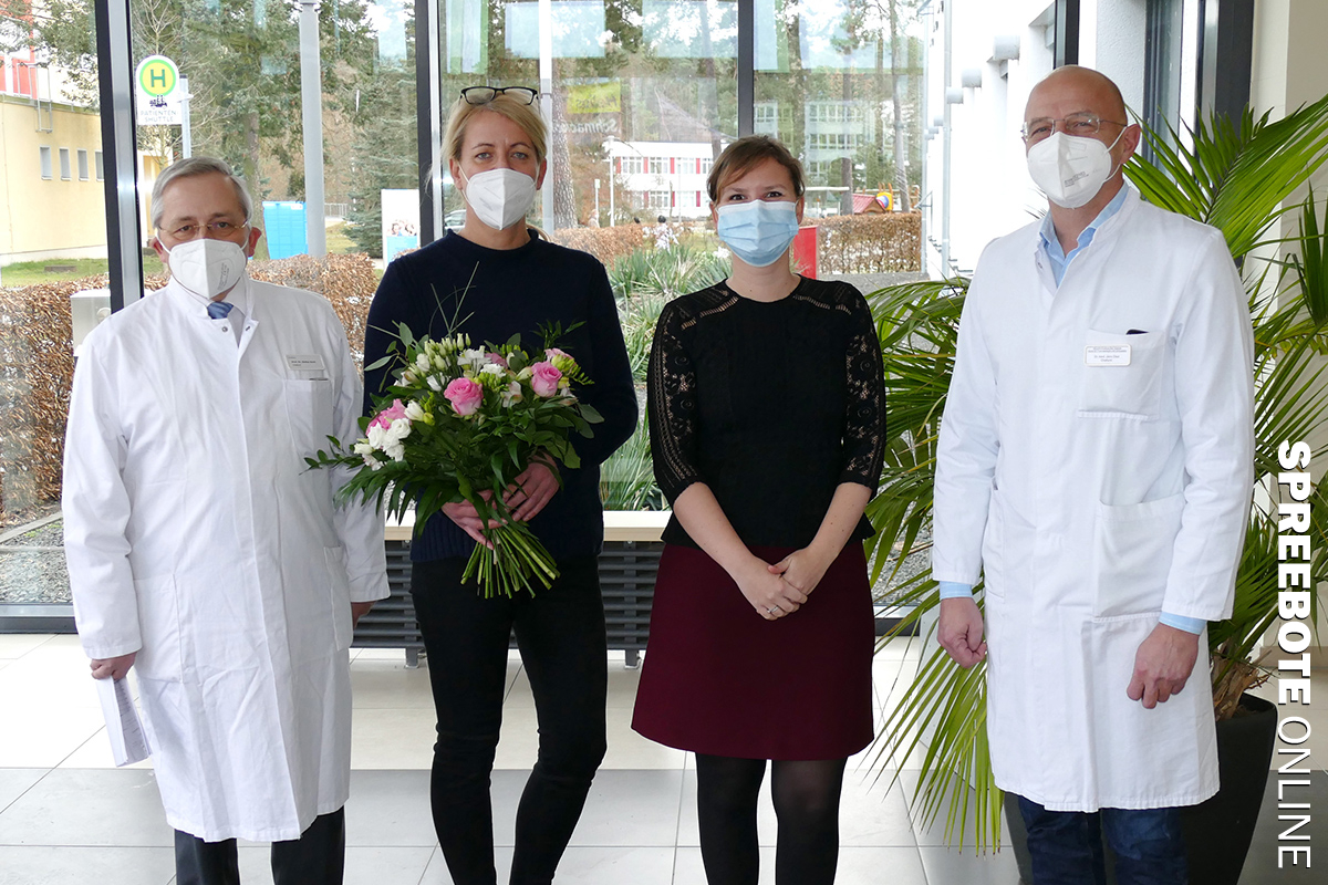 Bildunterschrift Titelbild: Die Klinikleitung heißt Helgrid Marschke herzlich willkommen: v. l. Wissenschaftlicher Direktor Prof. Dr. med. habil. Stefan Koch, Pflegedirektorin Helgrid Marschke, Klinikgeschäftsführerin Carmen Bier und Ärztlicher Direktor Dr. med. Jens Osel |